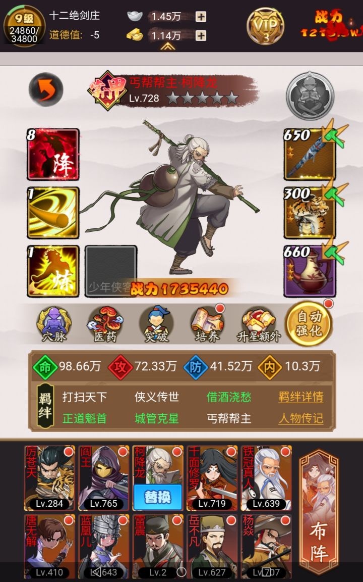 到后期,棍子真心蛋疼,想把乞丐换了,在纠结是换刀?青龙的羁绊集齐了,不过更看好丰田家康。和尚也满羁绊,不知道该怎么办了?求教各位大佬…