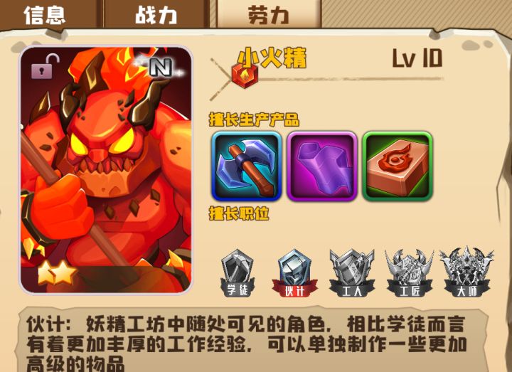 部分妖精升星后的劳力ps:同样的擅长提供的效果不一定一样。如:小火精和抱兮同样擅长加工妖精斧头,一个是减少时间间隔,一个是增加获得的经验。
