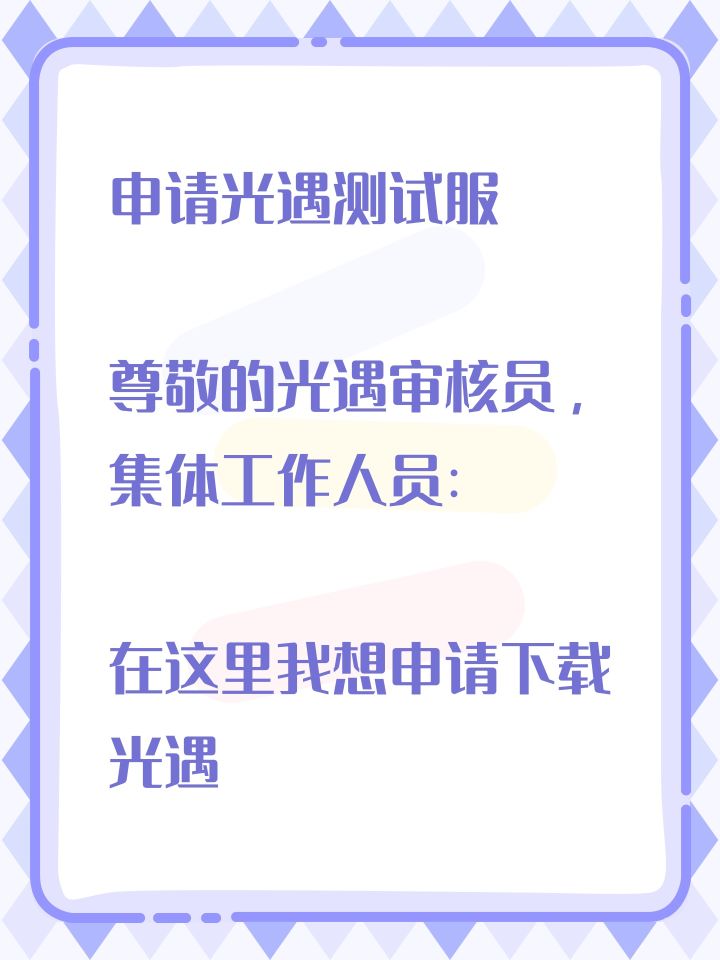 尊敬的光遇审核员,集体工作人员: 这里我想申请下载光遇测试服,原因主要有以下五个方面。 1.在官服光遇体验了游戏,觉得非常好玩,交了许多好朋友,风气也很好, 也了解到了游戏交给我们的含义。 2.想下体验服是因为想提前体验新的内容,会把一些建议积极投稿给官方。 3.光遇的自由性很高,很喜欢光遇的画质,会把一些不完美的地方的建议提交给官方。 4.非常喜欢这款游戏,玩了两年了,明白了这款游戏的