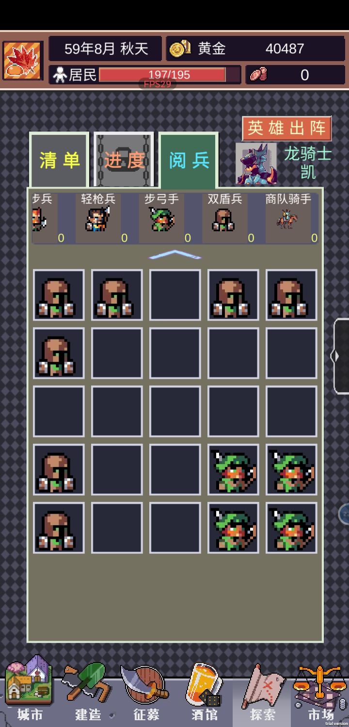 前期居民不重要,10个是防止炸档,不然几个就行,居民没了粮食没了就会极速掉钱,囤材料卖,现版本最缺的是皮革,只能刷副本,第一个副本刷几次,皮革够了直接出弓箭手,3盾3弓手或者更低的民兵配弓箭手,对了,这兵碰一下就算掉血,掉少于一个兵的血量算一个兵向上取整,无论怎么刷都会消耗,多放几个盾兵吧那个便宜,然后一定要有一个英雄,不然出不了兵打不了副本,都玩到这了后面就是滚雪球,打不过的副本就是你弓箭兵不够