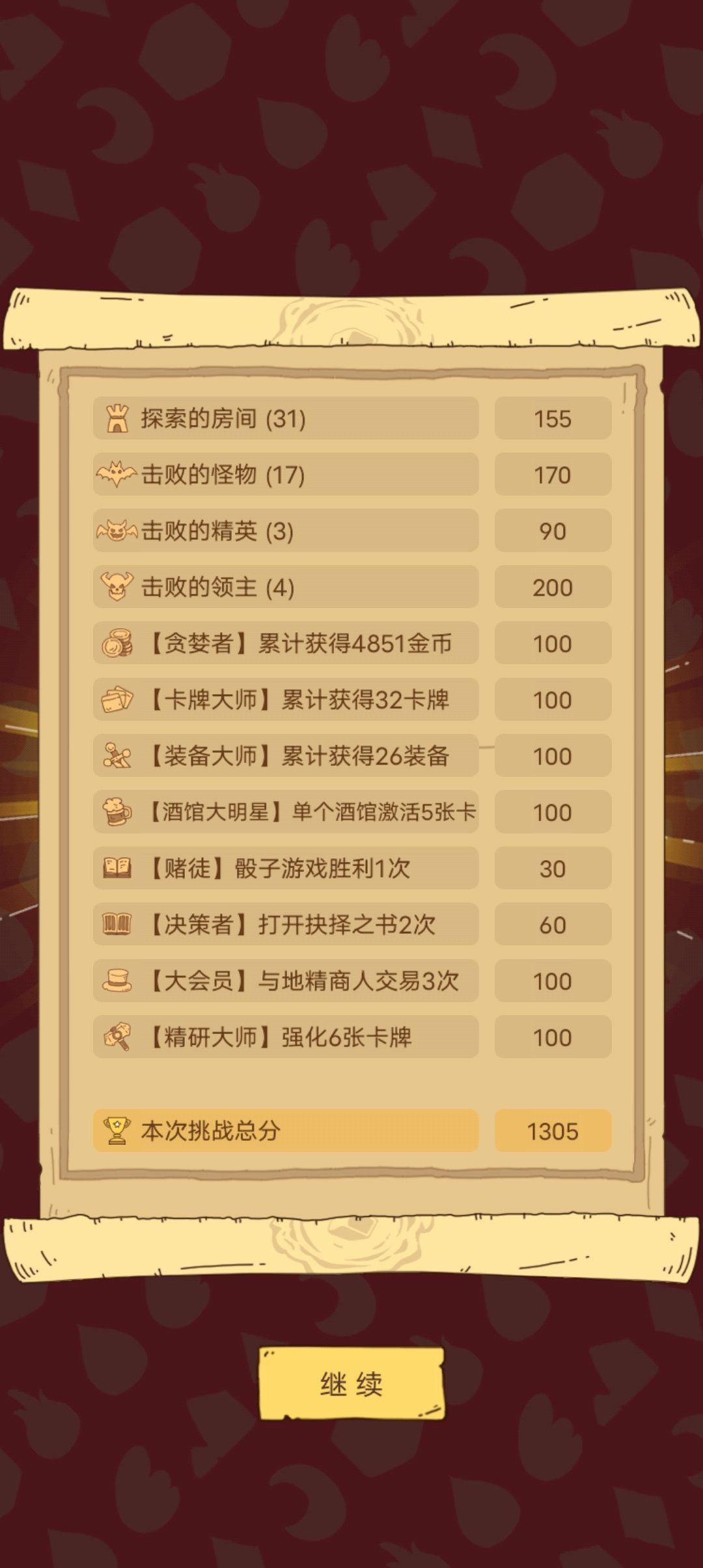从我今天打的每日挑战开始分析 1.击败的怪物 由于多打怪可以得分,所以我们对没怪的房间要考虑是不是要进入。一般来说,不需要进入的房间为泉水房和宝箱房还有一二层的商店,酒馆和事件房是需要进入的,第三层商店看情况进入。 2.强化卡牌和累计金币 到第三层恶魔处强化六次卡牌共需要1350金币(100+150+200+250+300+350)。 金币大部分是每层的酒馆利用sl刷金币翻倍得到(进入酒馆看有没有