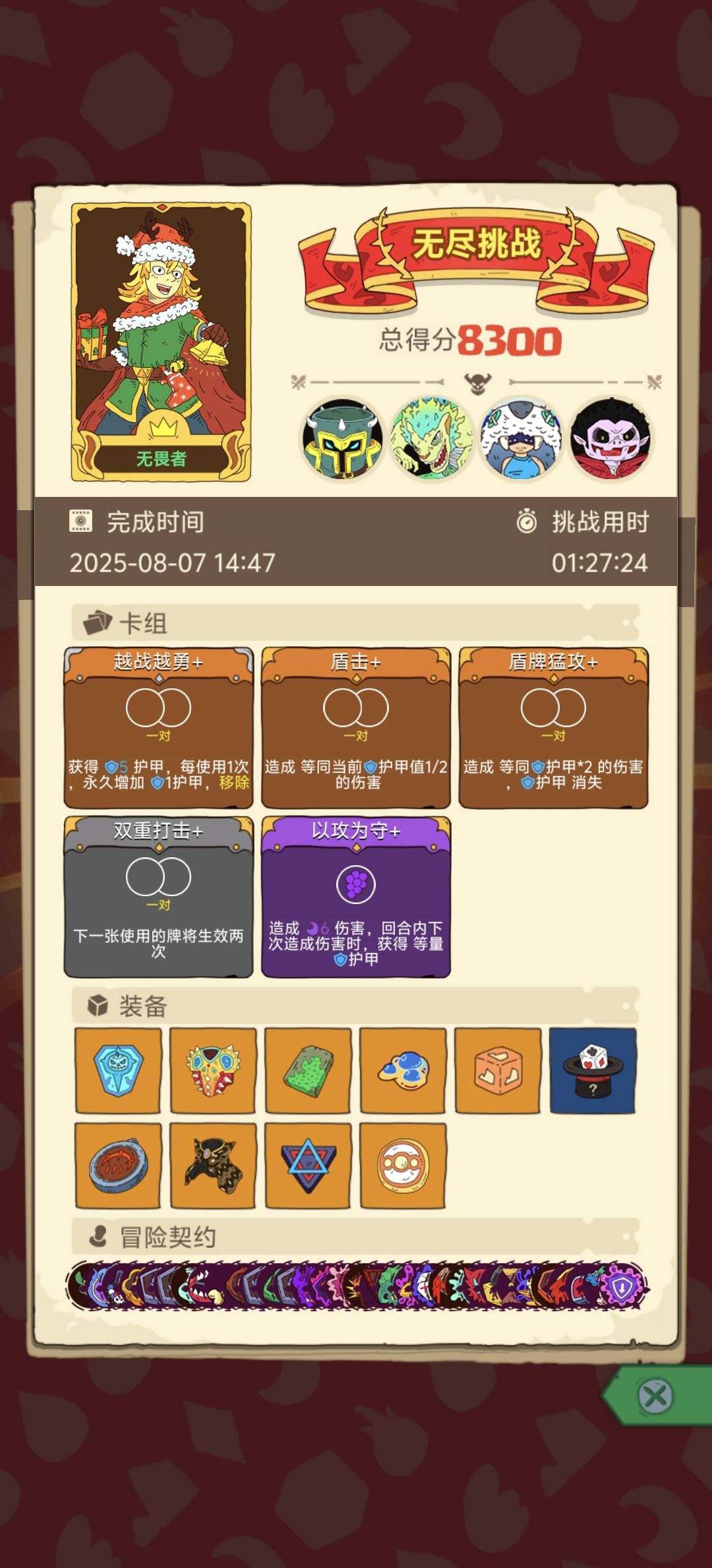 不需要出牌,凑齐这些装备之后,挂机都能过boss,没打过无尽,不知道在无尽模式有没有能破这个阵的。 狮王盾、祝福圣物、羊皮帽:稳定给护甲 青石板:掉血补护甲 大腿肉:护甲回血 古镜、尖刺服:护甲变伤害 直接形成闭环,护甲越打越多,挂机过boss