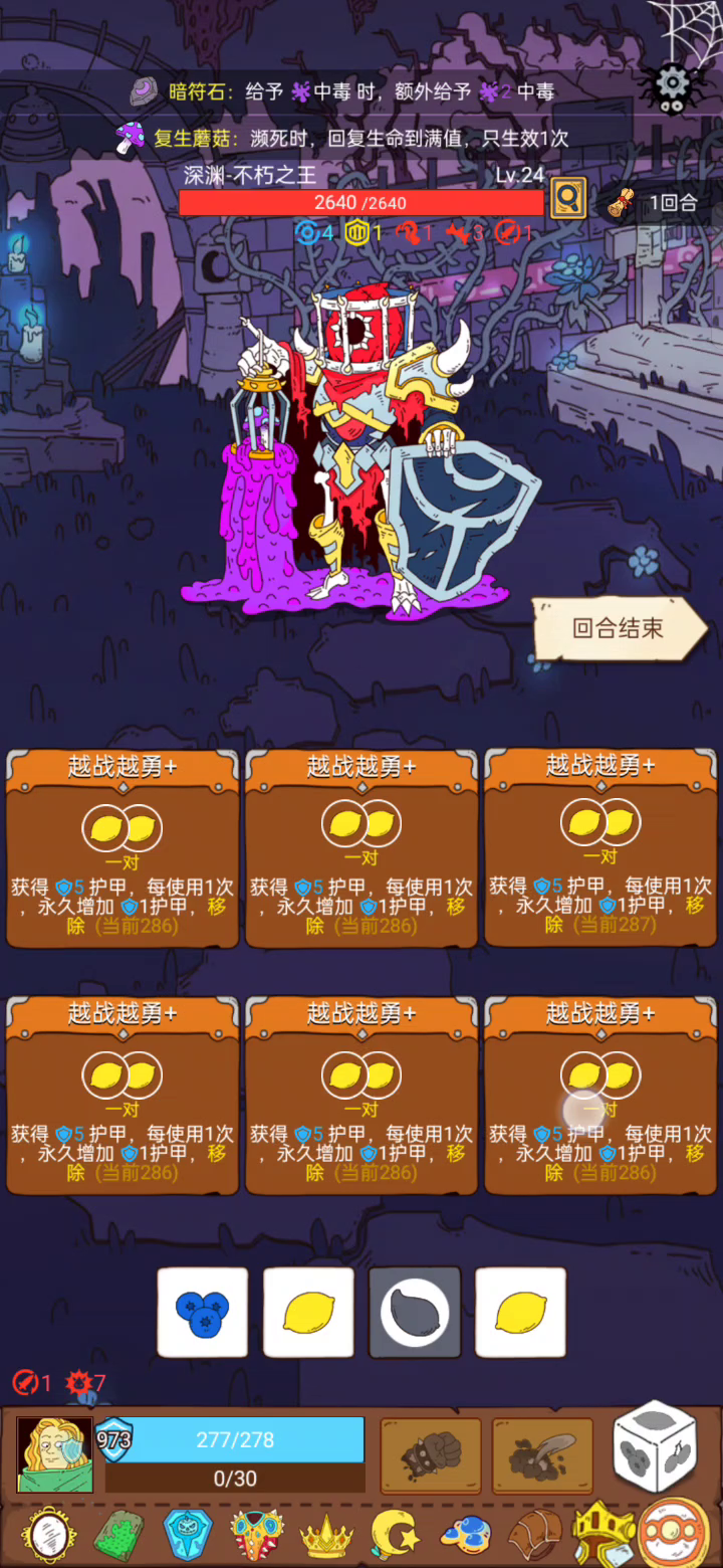 核心装备足够能保证不死,怕伤害不够就玩叠伤流,推荐中毒流和反伤流,易伤流对骰子颜色要求高不推荐。