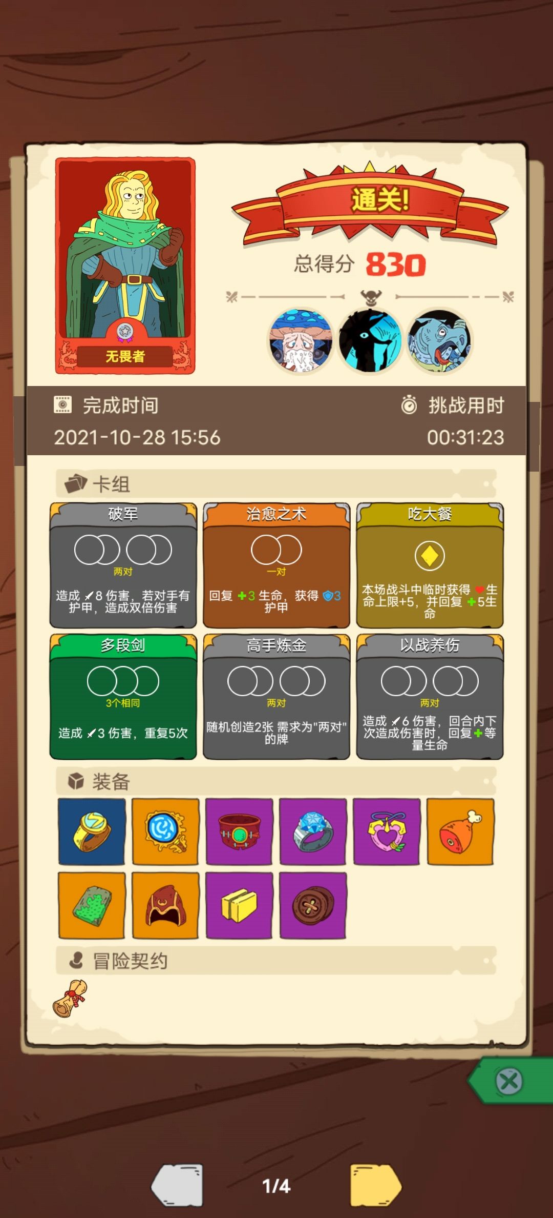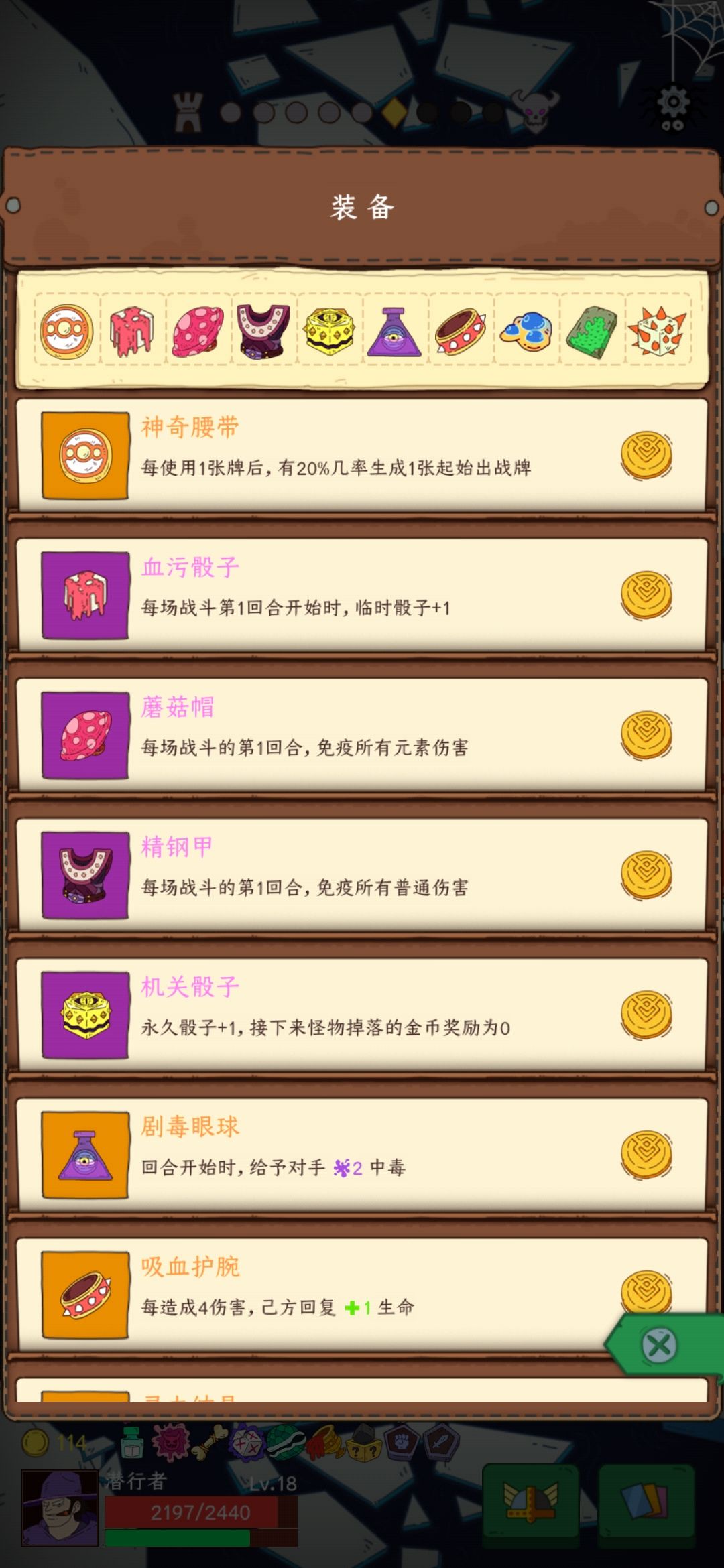 零氪速通王者模式!无畏勇者 核心装备(续航):羊皮冒、古董瓶、星月符、青石板、幽灵面具,这些装备有2~3件足够,最好是回血+护甲值。其他装备随便搭,当然有金砖、钻石戒指更好。 核心装备足够能保证不死,怕伤害不够就玩叠伤流,推荐中毒流和反伤流,易伤流对骰子颜色要求高不推荐。 中毒流: 核心卡牌:毒影针,最好有新手炼金或炼金高手,其他牌用无色差要求的牌。玩法核心是叠毒。 反伤流:核心卡牌:吃大餐,最好有新手炼金或炼金高手,其他牌用无色差要求的牌。玩法核心是叠最大生命值,该玩法还需一个必备装备皮腰带。 酒馆可sl刷想要的奖励,推荐金币。 有金币就可以在商店里面刷新购买核心装备。