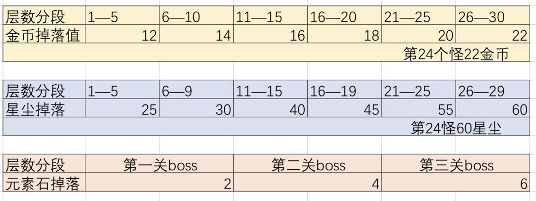 基础掉落:前1-30怪物基础掉落(每10个怪对应一关) 实际掉落:基础掉落*符文加成比例 金币掉落计算=实际掉落(*幸运金币加成,没有该契约不计算)(*诅咒宝典,没有则不计算)(*贫瘠试炼,没有则不计算)(+金砖加成,没有金砖不计算含有诅咒宝典,金砖增加量也变为0) 星尘掉落计算=实际掉落(*银色vip加成,没有则不加成) 适用于普通模式(新手高手大师王者),每日挑战,自定义挑战,无尽前3层 (p