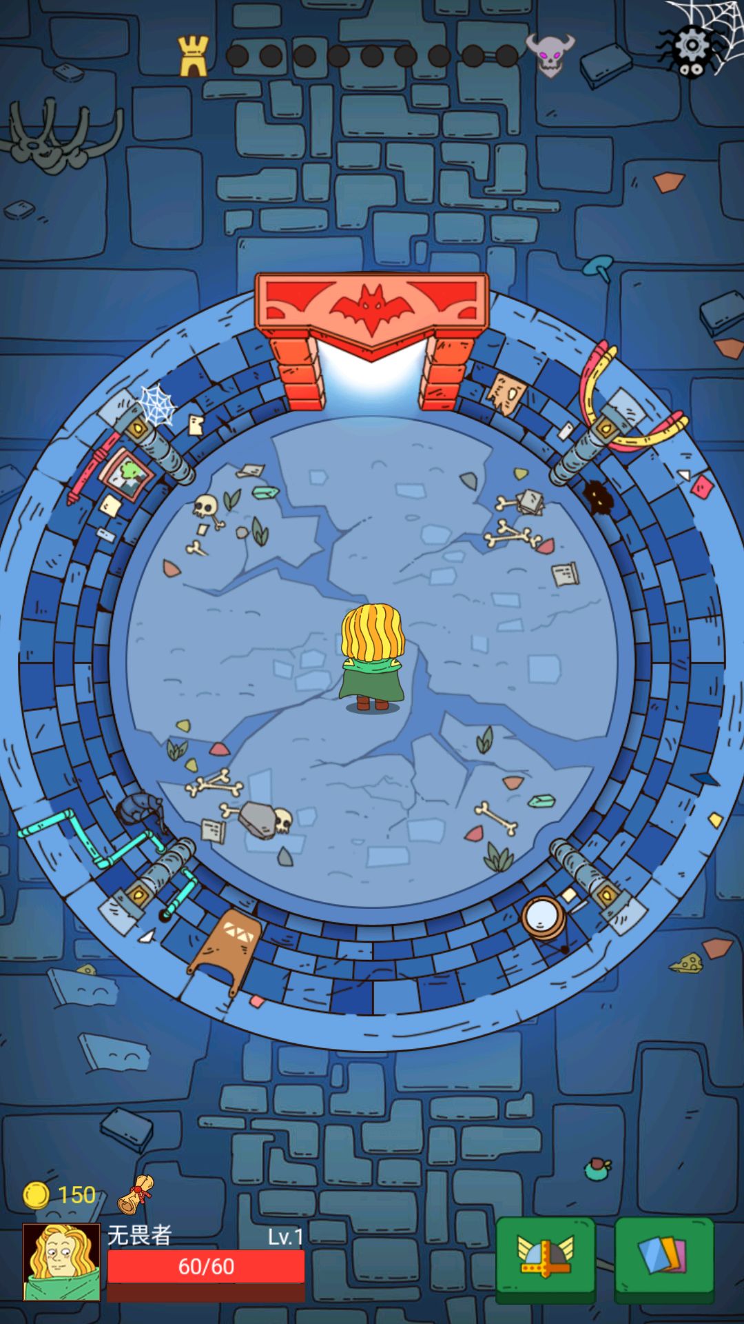 首次进入到游戏关卡的玩家,都会被带到空空如也的休息室。 请新玩家无视地上看到的骨堆,这些不过是医用教学道具~ 好了,直接点上方的门,走出休息室,开始冒险吧! 画面最下方的信息,也给新玩家做一下简要说明。 初始冒险者都会携带一定数量的金币,比如这次冒险是150枚。 在金币右侧是冒险契约,让我们打开之后康康: 因为是简单而普通的冒险,所以规则也显得非常简要。 左下方是无畏者因常年考场作弊而留下后遗症的