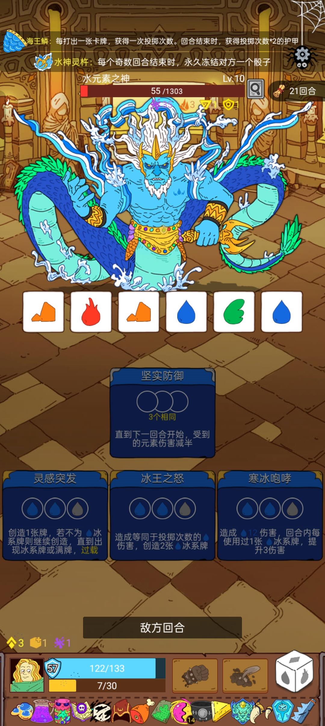 这把主要风系+普攻元素双倍+伤害双倍+易伤受伤加60%打爆发,主要是开局吃了个每回合限用6牌的buff,没有其他选择。但没想到打到这还是祭了,一个第一回合怪物受伤强制为1,一个免疫x4,选谁都难,最终选了免疫果然打不动怪了。。。原先一个风再配合残血伤害翻倍能打420,结果现在就140+,完全打不动4000+的怪。。。所以,兄弟们,玩风特别怕免疫x4,再加上我没带易伤牌,也没刷那个无限成长的风魔法,