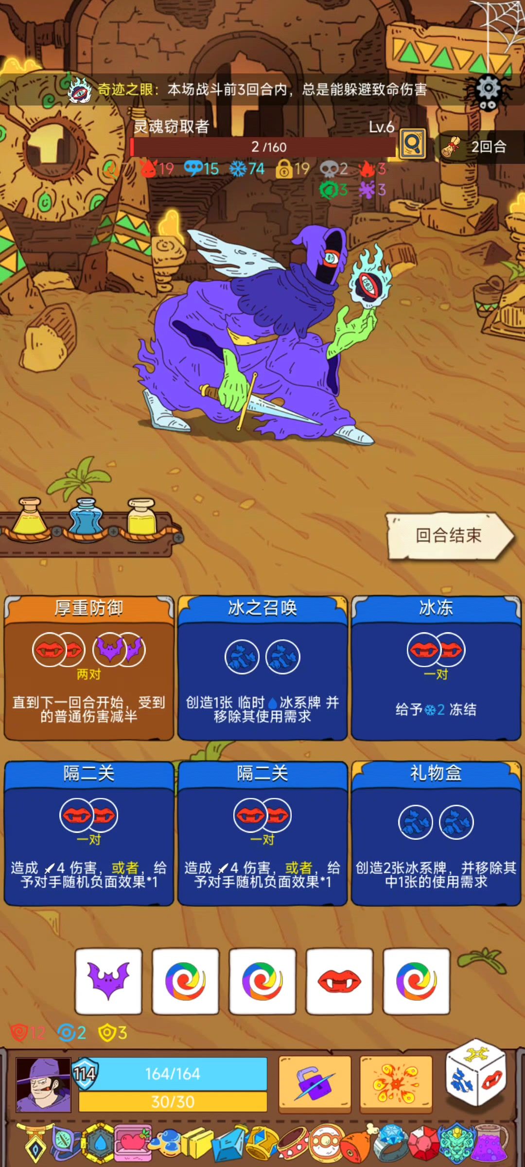 隐藏boss--暗元素之神 开局扔你手牌,还给你一堆中毒和2层诅咒,中毒还扣怒气值, 但是有什么话跟我的粉宝石说去吧,而且我用“新手炼金”还刷出了一个免疫诅咒的临时装备,还有20%的概率复制手牌的“神奇腰带” 到了我的回合,只要能打出“土灵术”基本就稳了,直接跟上“地震”跟“子弹泡泡”打伤害,而且还有一定概率用“神器腰带”刷出手牌(我其中一个回合砸了4发地震跟3