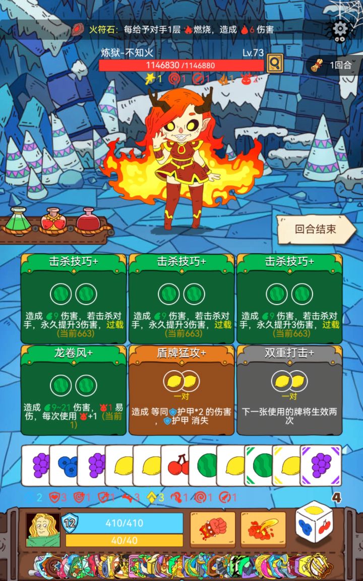 一个水属性加2护盾,四张同属性给对方上负面buff,要不是有无敌一回合就给他秒了