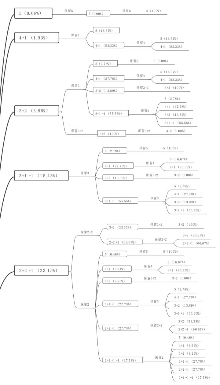 一、不考虑对手(双盲)5>4+1>3+2>3+1+1>2+2+1>1+1+1+1+1>2+1+1+1分别记得分为7654321(这样记分计算期望应该是合理的吧,如果不对还请大佬指出)以下是概率树状图(原图太大发不出,只能拆成两半)1+1+1+1+1明明那么稀有,为什么是倒数第二菜的……不过如果1+1+1+1+1真的是高分牌型那我可就要算死了需要进行抉择的有三种情况:(1)3+2 如果
