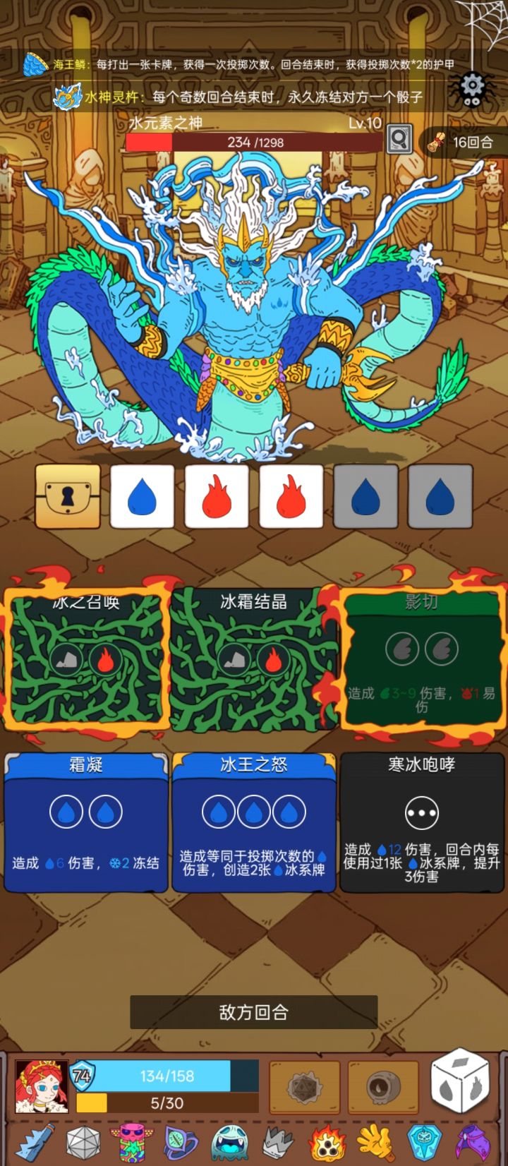 一个水属性加2护盾,四张同属性给对方上负面buff,要不是有无敌一回合就给他秒了