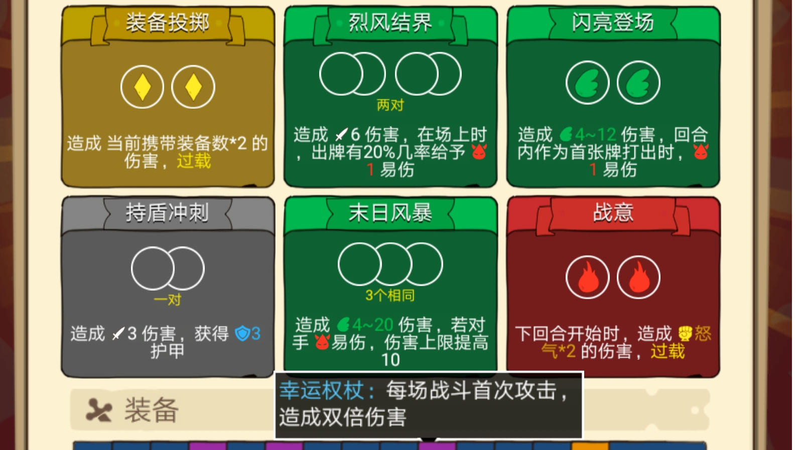 核心卡牌:任何造成怒气伤害双倍的卡牌,下次攻击双倍伤害的卡牌 核心装备:幸运权杖(战斗中第一次伤害双倍),有增加十点怒气上限的装备更好 尽量不带伤害卡,带套盾或者回血卡来过度,权杖一定要用在怒气双倍伤害上,boss没有480血就直接秒