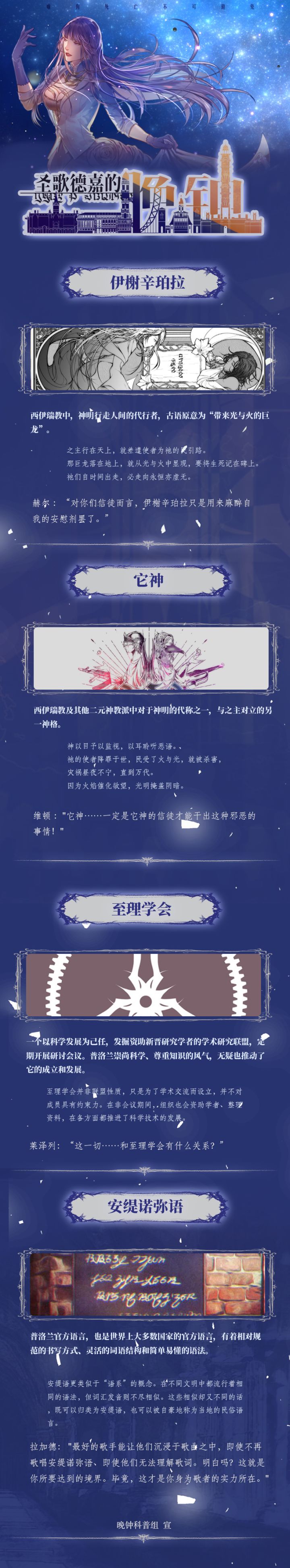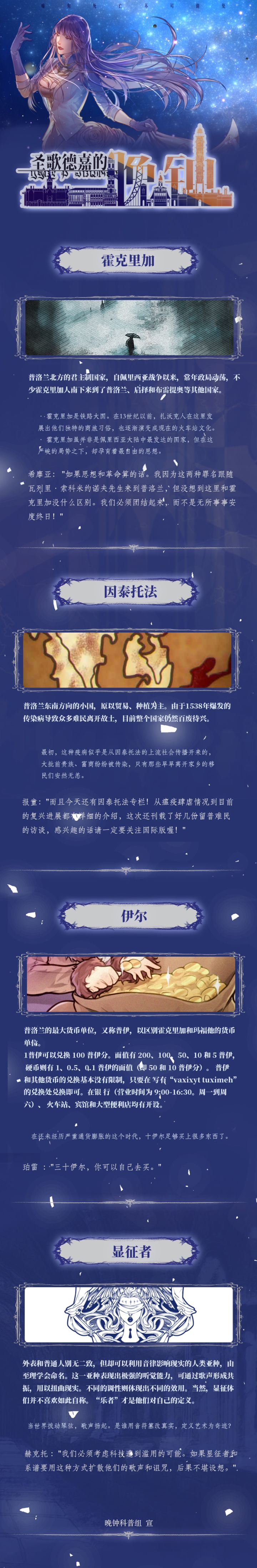更新快来了!!大家好,我是喜糖,一个标题党惯犯,但是这次我没有当标题党,哈哈,没想到吧!只是小小剧透一下而已,因为晚钟再不更新我都没什么东西好科普了今天给大家带来的是科普大杂烩,不仅有两个普洛兰之外的小国,还有世界观下的两个名词解释。注意:在现在逐步展开的主线剧情里,显征者扮演着相当重要的角色,我有一个朋友因为搞不明白剧情,反复让(——)死了好多次,希望大家可以吸取她的教训,仔细读读科普,