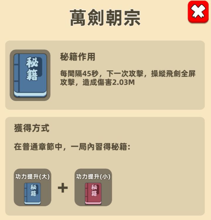 金钟罩+暴击=后发制人功法提升(大)+功法提升(小)=万箭朝宗吸血+布置陷阱+二段伤害=追踪炸弹葵花宝典+东方剑法+蓄力一击=移形换影环绕飞剑+环绕毒剑+血量提升=剑气逼人排山倒海+背向攻击+会心一击=独孤九剑战头大师+以退为进+活力充沛=凌波微步