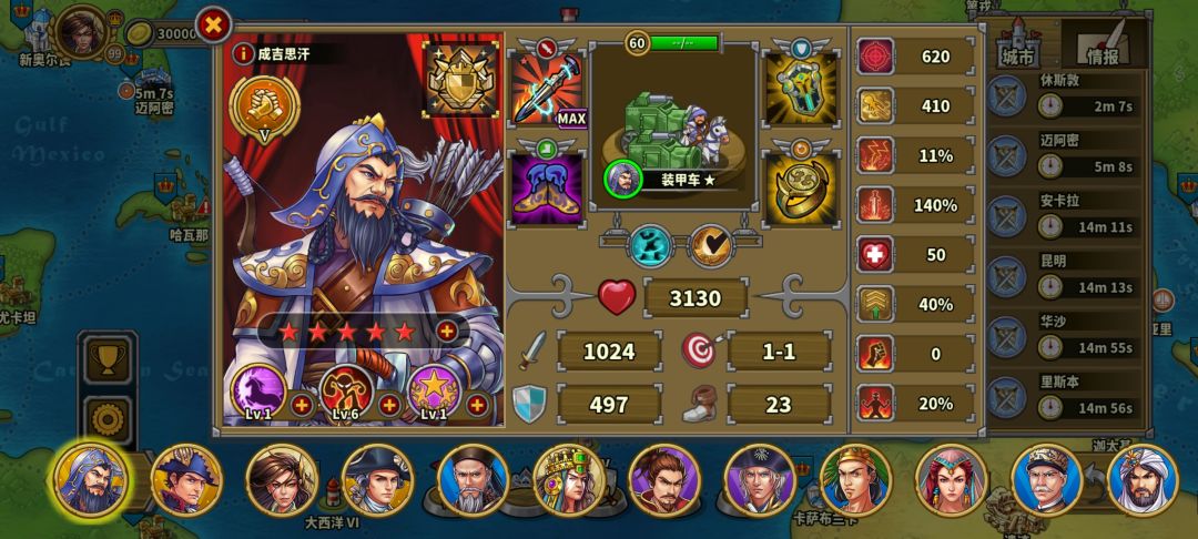 将领(可能有些限时还没轮到)和徽章全部买齐,不过还是以弓指为主,因为速不台实在强。 这篇只到领低保(帝国界面攻城+战斗+建设=155)为止,将领齐全可选择的太多了,尽量剩点勋章让各位自己玩。 ————————(配装如图) 开局——帝王时代 打完战役如果卡在帝王时代升不了航海时代,就去把征服的成就做了,做的时候记得选奖励是文献的国家。 ——— 推荐将领1:速不台、华盛顿(跟随时代升星) 技能 野战之
