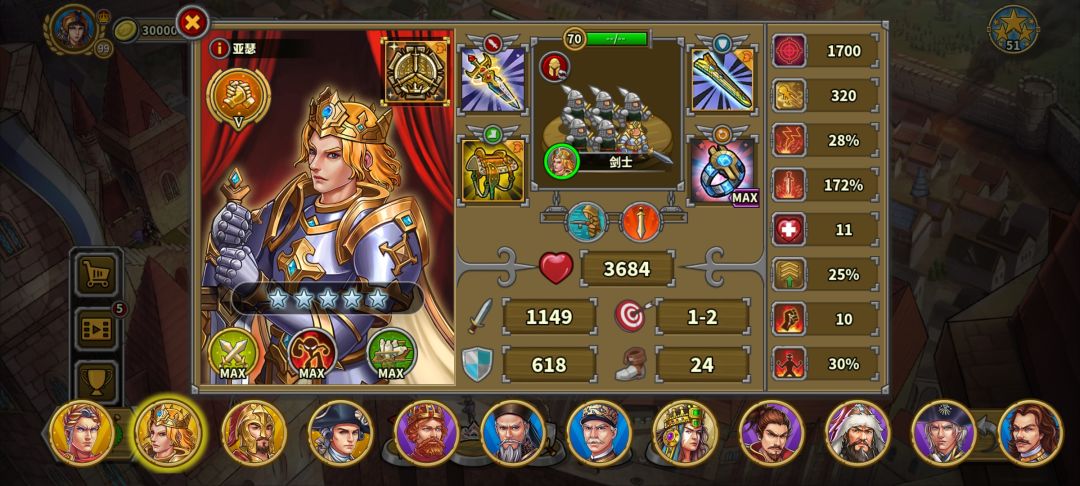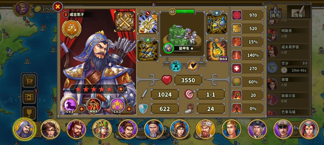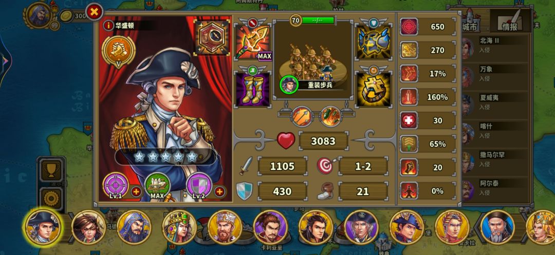 将领(可能有些限时还没轮到)和徽章全部买齐,不过还是以弓指为主,因为速不台实在强。 这篇只到领低保(帝国界面攻城+战斗+建设=155)为止,将领齐全可选择的太多了,尽量剩点勋章让各位自己玩。 ————————(配装如图) 开局——帝王时代 打完战役如果卡在帝王时代升不了航海时代,就去把征服的成就做了,做的时候记得选奖励是文献的国家。 ——— 推荐将领1:速不台、华盛顿(跟随时代升星) 技能 野战之