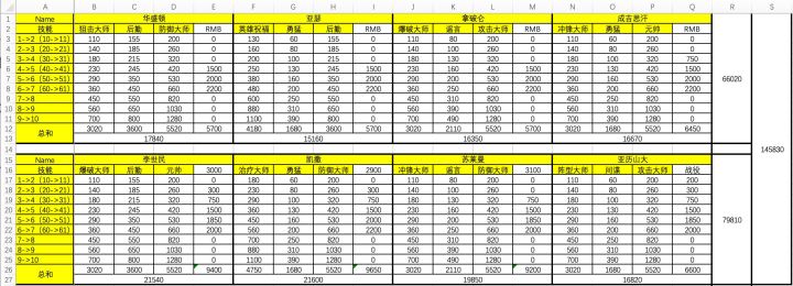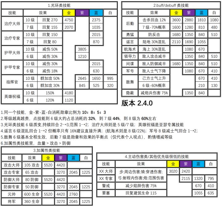 个人统计的数据,希望大家能发现一些错误的地方,让表格更准确!有的将领没升级过,有些数据还不知道,希望知道数据的好兄弟在评论区留言,我会给补齐。经过评论区留言补齐数据共54将领,表格总和是505310勋章8金将12紫将19蓝将15白将