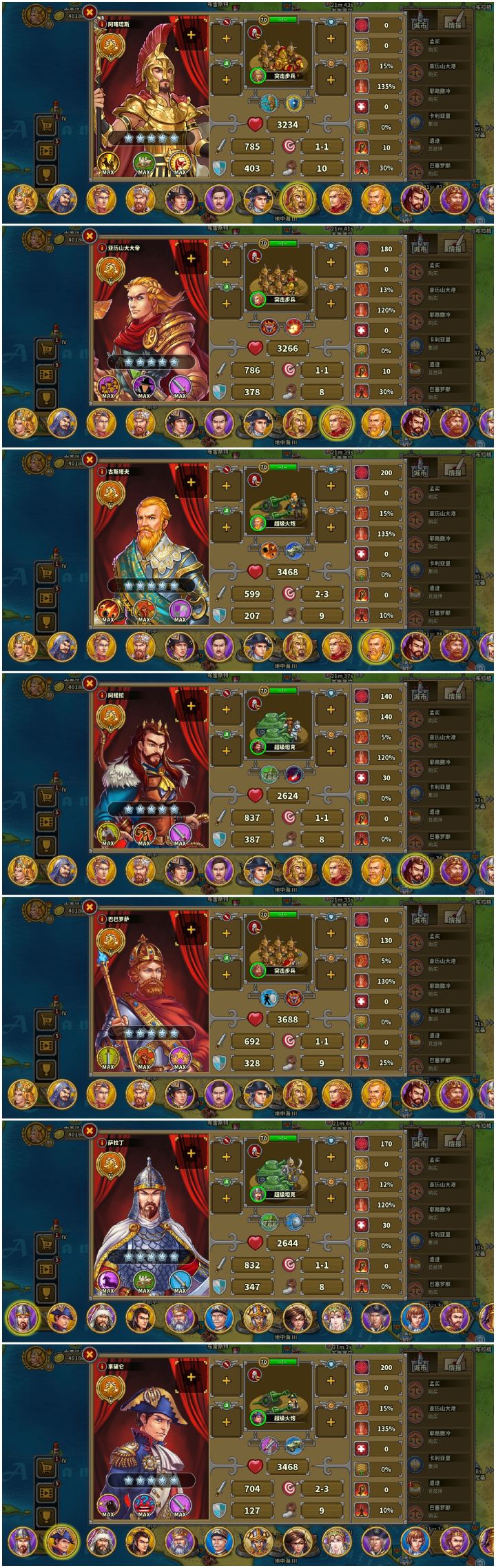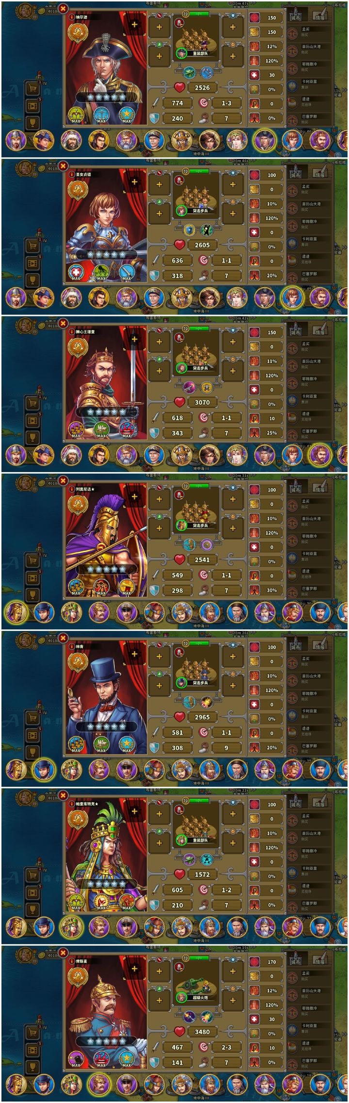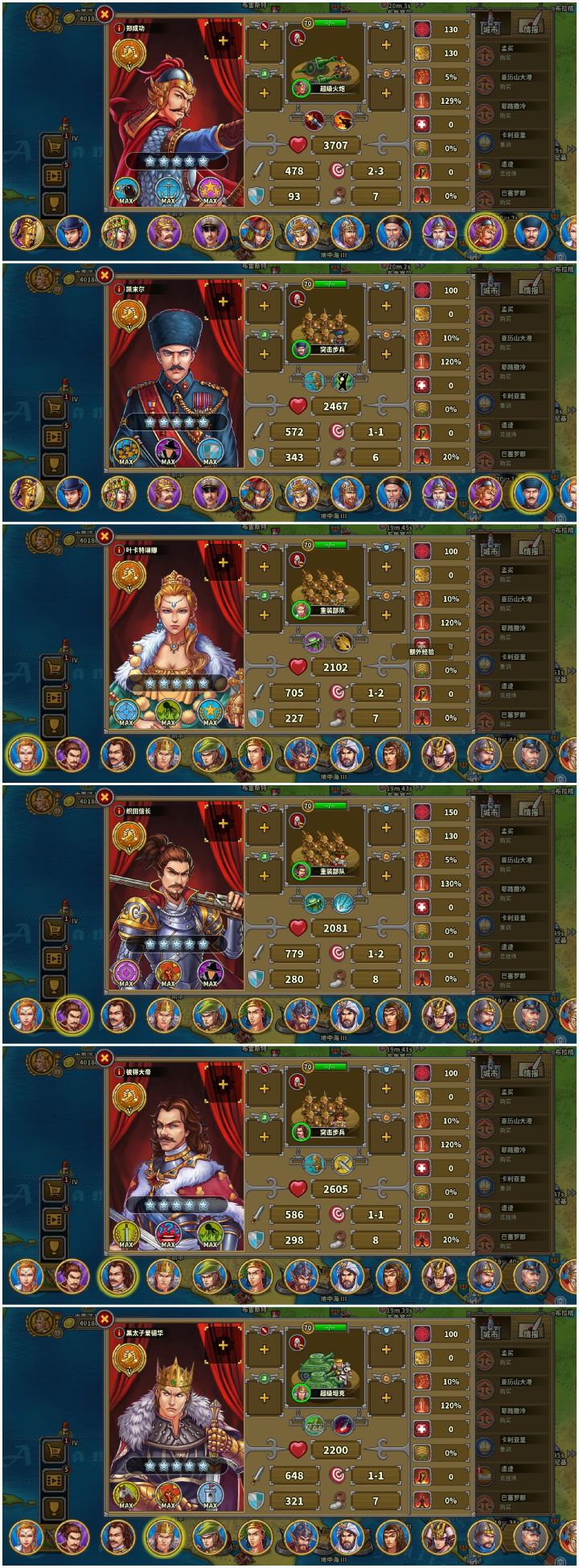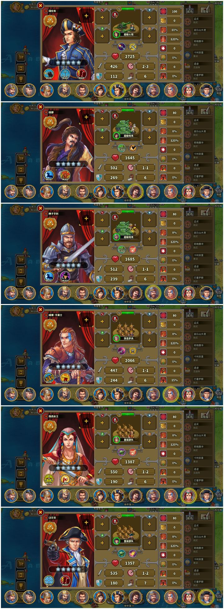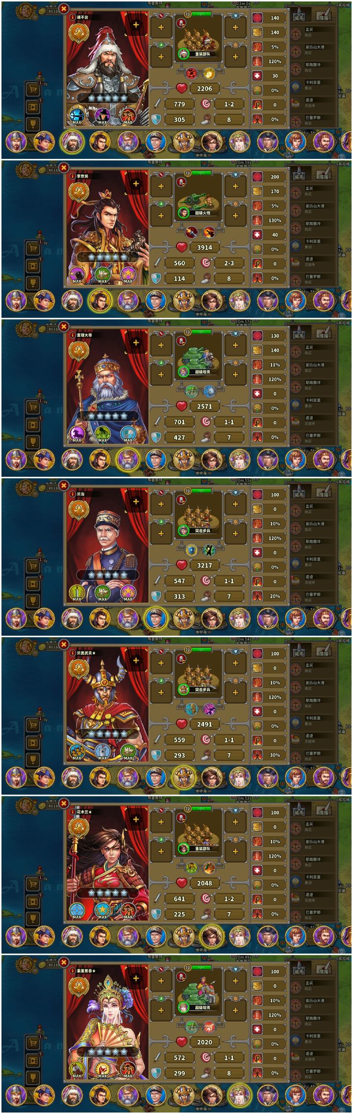 先上图证仅氪一个特权省事,对战力无提升再附上养的将这个档以弓指为主,通关顺序大致为战役前六章,困难,第七章破晓前,炮8,婆罗洲,步8,特奥蒂华坎,骑8,喀山,马恩岛,帕特拉斯,弓8,破晓。传说,神庙之类的看情况,大致都在婆罗洲前全通,具体时间忘了。这么一套流程下来,体验了一把零氪的历程,而且各个关卡的通关配置都算是比较低配的,除了弓炮,部分步骑指的指挥官都只点到8级,低配全通还是比较有成就