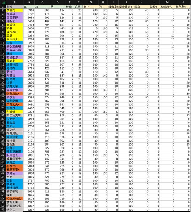 2023.9.26:修正部分特性和数值错误更新至2.6版本;新增将领速不台、古斯塔夫;修改少量文本;目前含四张兵种分表。制作过程中感谢doubby大佬给了不少建议。由于纯手打所以可能会出错,欢迎指正。更正!:所有后缀为(神)的将领,入手方式均为竞技场(普通形态仍同表内)参考:tap论坛yu大佬doubby大佬贴吧xckkmmm大佬和某位不知名大佬(收了图,回头想找找不到帖子