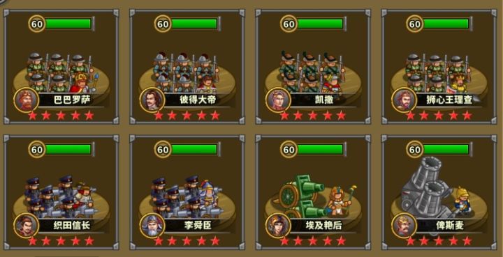 这关阵容配置要高,图中的无名将全员圣骑套,步骑将有铁甲,弓将二段攻击,谣言减攻防都有,可以说是非常恶心!估计城堡里有近40个无名将(就是很多)。1.下面是我的阵容2.装备情况(第一次通关时)四个套装都有(圣骑、奥丁、泰坦、龙骨),奶瓶,删除枪是满级的,弑神剑和天丛云都是8级,其他都是1级。勋章就没有工业章。3.攻略开局,步兵营上减费公主,一直造步兵,下面骑兵营5%恢复公主(看大家守家部队