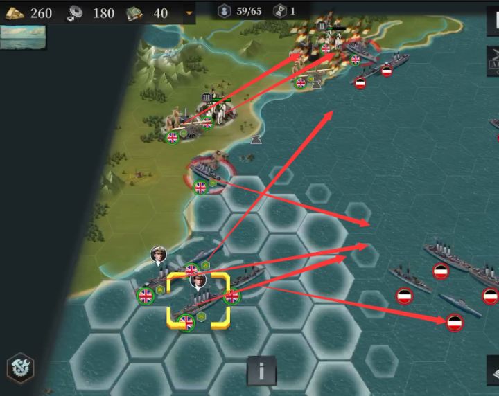 各位指挥官大家好,今天给大家带来战役的攻略思路第六期,欢迎大家一起留言讨论~第五章海洋霸主第三关:突袭斯卡伯勒开局给巡洋舰任命海将,最好带好回血装备,前进方向如图,海军先帮助清理靠下的敌军,潜艇和陆军上去帮助防守。上方防守注意尽可能保证有一个步兵贴着港口,方便随时占回来,炮兵合理攻击,血量保持健康,最大化伤害。当右下的敌军开始移动后,尽量攻击并拖住(可以边打边后退,保持不被围攻)。一般靠着援军