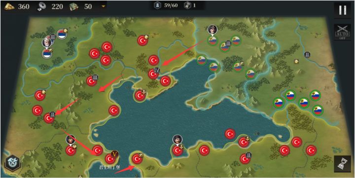 各位指挥官大家好,今天给大家带来战役的攻略思路第五期,欢迎大家一起留言讨论~第四章奥斯曼余晖挑战第四关:第一次克利西亚战役1.上好将,一部分往下援助友军,友军之后会不堪重负,就占城。另一部分前往左边海岸,这将是之后防御的重点。右下方继续保持战斗,另一部分部署海防,需要增加兵力就招募军种。2.右下方法军消灭殆尽之后,调集兵力往左,在下一回合左下角一直没动的敌军会登陆作战,需要积极防御。左上位置