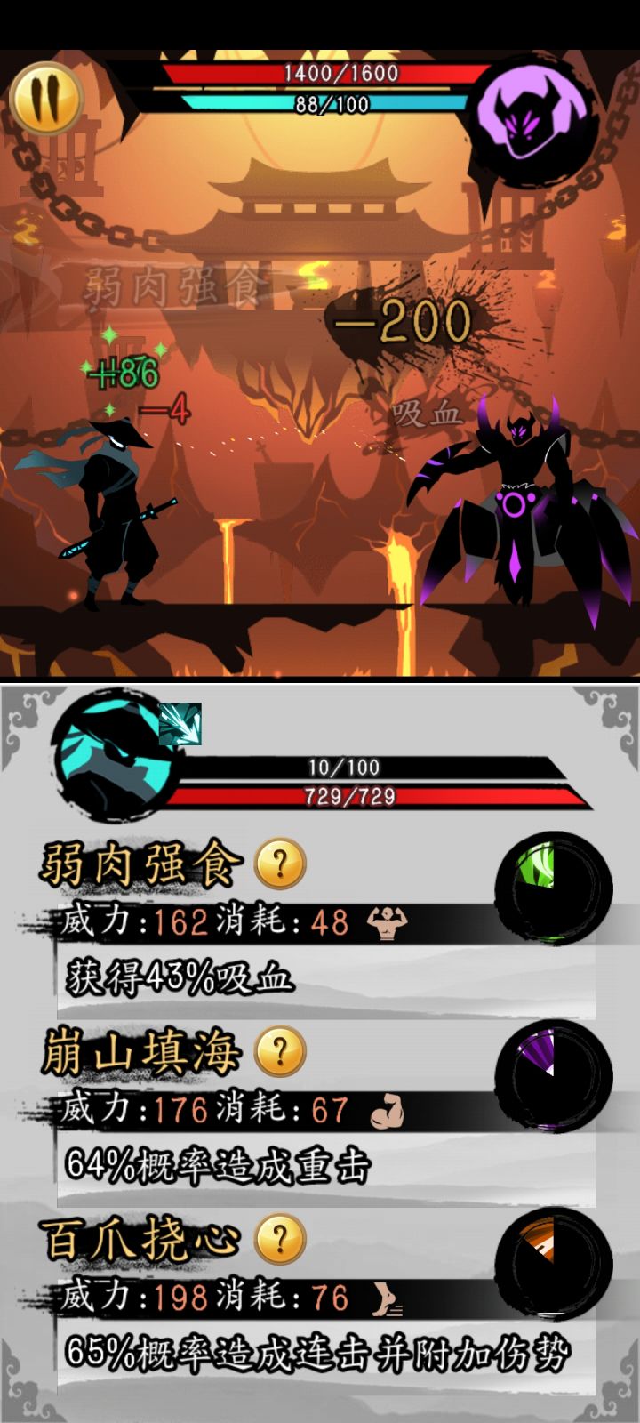 写一篇灭气暴击流攻略吧,这游戏不难。流派特性是暴击高,刀刀暴击,三刀带走一个人,灭气,让对面不能出手,基本上我出手两下,对面出手一下。血量基本保持满状态。一、招式必备:主动技能1.杀威剑,扫六合等减对面怒气的技能,减怒气尽量30以上,控制对面怒气值不到100,不到100就不能出手,伤害尽量在100以上才能用。暴击后伤害150左右,主要使用技能,消耗60。2.吸血:一夫当关,基本回血在20%