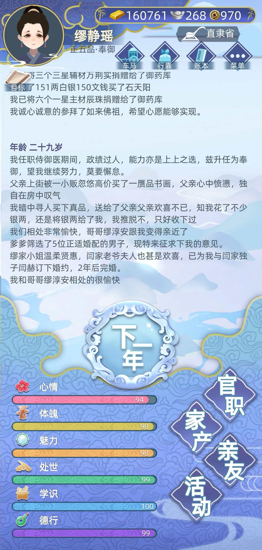 29岁达成最高等级女医。 首先女医线的重点是 发现高品级的药材! 配出高药效的药方,治疗疑难杂症。 1.建议至少第二世再玩女医,前几世多攒钱。 #可以先把户口迁到直隶县,再生孩子,然后等孩子八岁确定学医后再结束人生,然后再继承人生,不然有可能被父母以家穷为理由被拒绝学医。 2.继承人生后,每年都去药材铺买药材。 #选定一种益气的药材(囤10个到15个),和一种药引(囤20个) 例如:灵芝盖-主材,