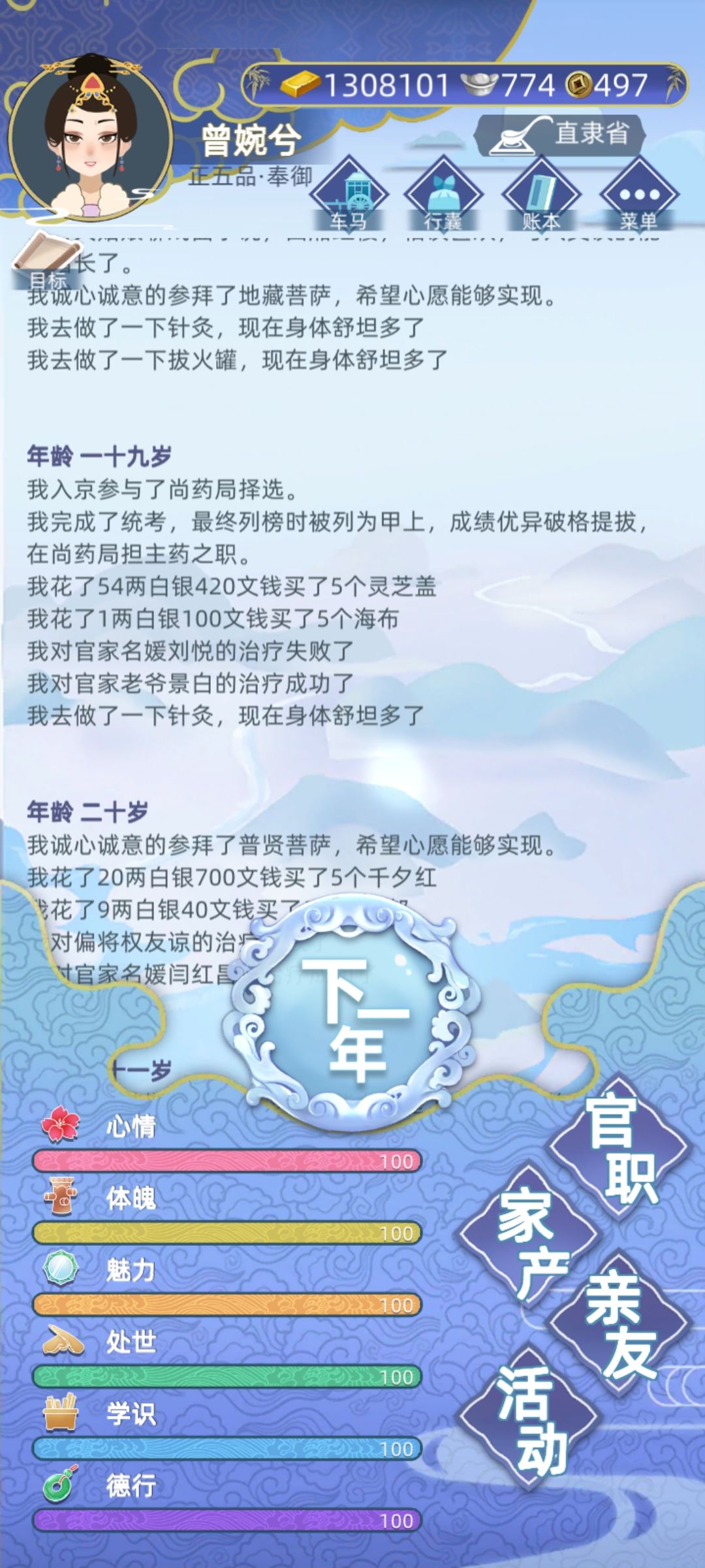 首先前世也是女线并且开有钱柜,然后自从小孩3岁后,每年在钱柜里面给她培养(全选),建议多生几个每年一个或者隔一年这样,防止只生一个长大后不学医,小孩学医到了11岁,你就可以去继承她了,这时候通过你的钱柜培养小孩除了学识其他属性基本都是满的,我们继承后,就客栈找秀才或者捕头聊天,拜文殊菩萨提高学识,然后就是查漏补缺把所以数值拉满! 期间的女医考试很重要!!!一定要全部答对,答案在论坛里面都有可以切屏