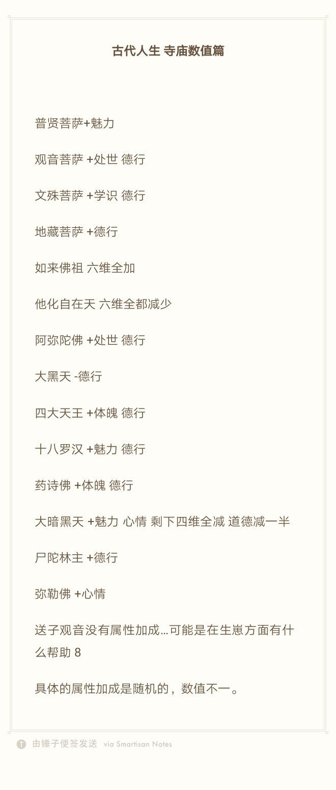 全都整了一遍,之前的不全而且有的不太准,下面的可能还是有不准确的,但是应该不会有太大差别,望谅解啦。 普贤菩萨+魅力 观音菩萨 +处世 德行 文殊菩萨 +学识 德行 地藏菩萨 +德行 如来佛祖 六维全加 他化自在天 六维全都减少 阿弥陀佛 +处世 德行 大黑天 -德行 四大天王 +体魄 德行 十八罗汉 +魅力 德行 药诗佛 +体魄 德行 大暗黑天 +魅力 心情 剩下四维全减 道德减一半 尸陀林主