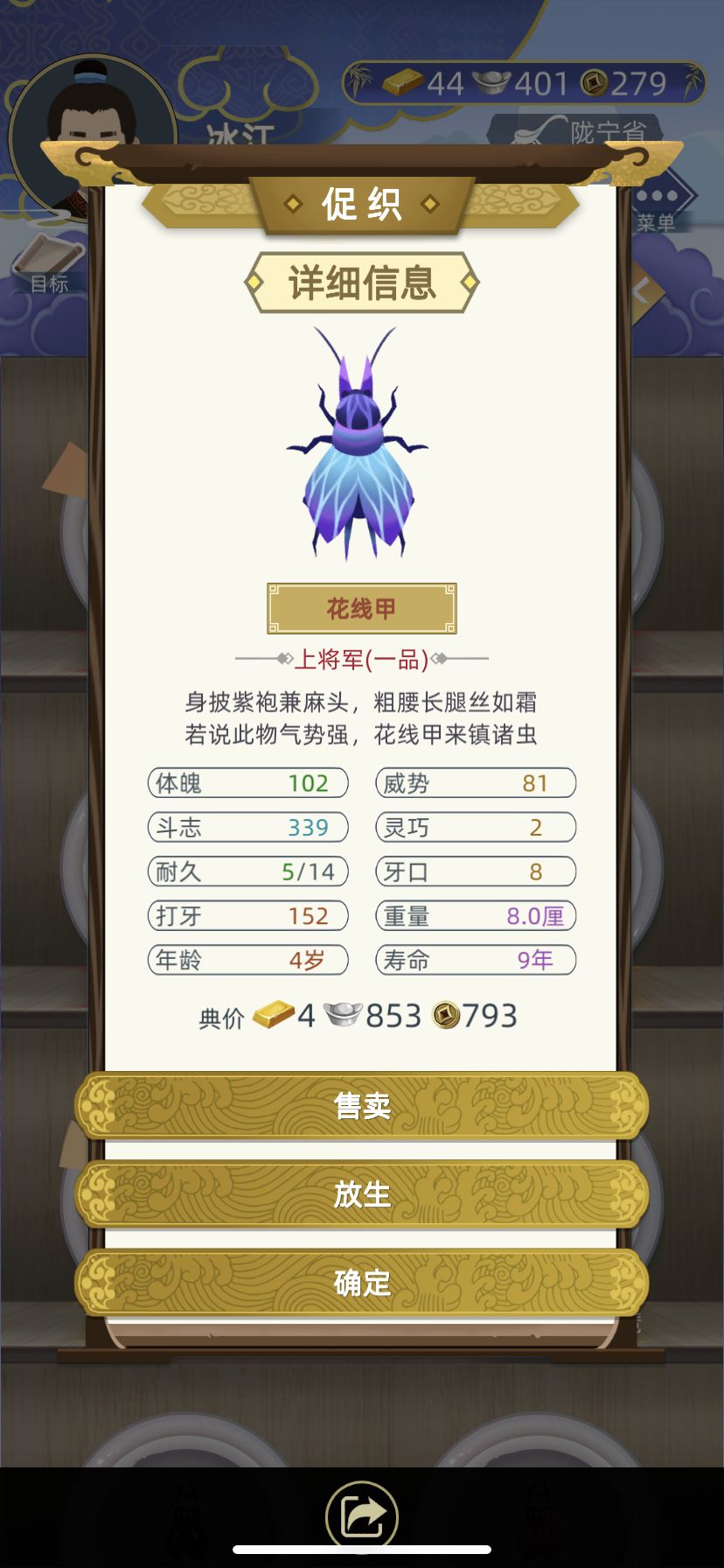 玩这个游戏玩三周目了,斗蛐蛐才是大家发家致富的开始,存钱从小开始。到成年了结婚生子找几个漂亮小妾生几个帅儿子小棉袄的[表情_开心] 话不多说开始总结,我只总结一到三品的蛐蛐,因为四品的数值有不确定性,加上摆大长桌的基本都是三品起步 1品20以上数值血量抗压150都算及格/2品也就那几只详细说/3品浮动太大,有甚至高于1品的威慑力乃至高达37但血量低到40,也有数值全比过2品第一飞电黄的就很离谱还