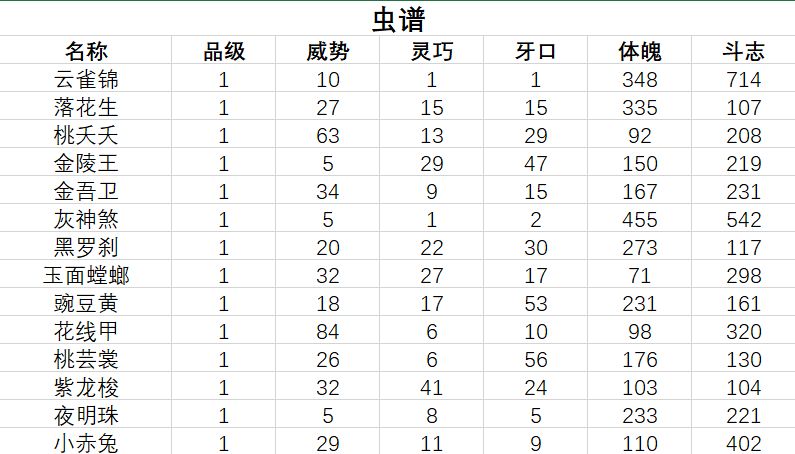 促织是这个游戏里我最喜欢的部分,因为能够特别直观地感受到制作组的用心。初入坑的时候,我能关在房间里捉一天的蛐蛐,参加大赛,为子孙后代进行资本积累。 个人认为这个功能最大的特点是:一半看运气,一半看实力 这就意味着,哪怕家境贫寒,也可以靠着父母给的几百个铜钱自己抓蛐蛐参加比赛富甲一方!为了提高大赛胜率,整理了这个促织虫谱,跟各位道友共享。 大家会发现 蛐蛐名字的基本构成是“颜色+品种” 目前只整理了
