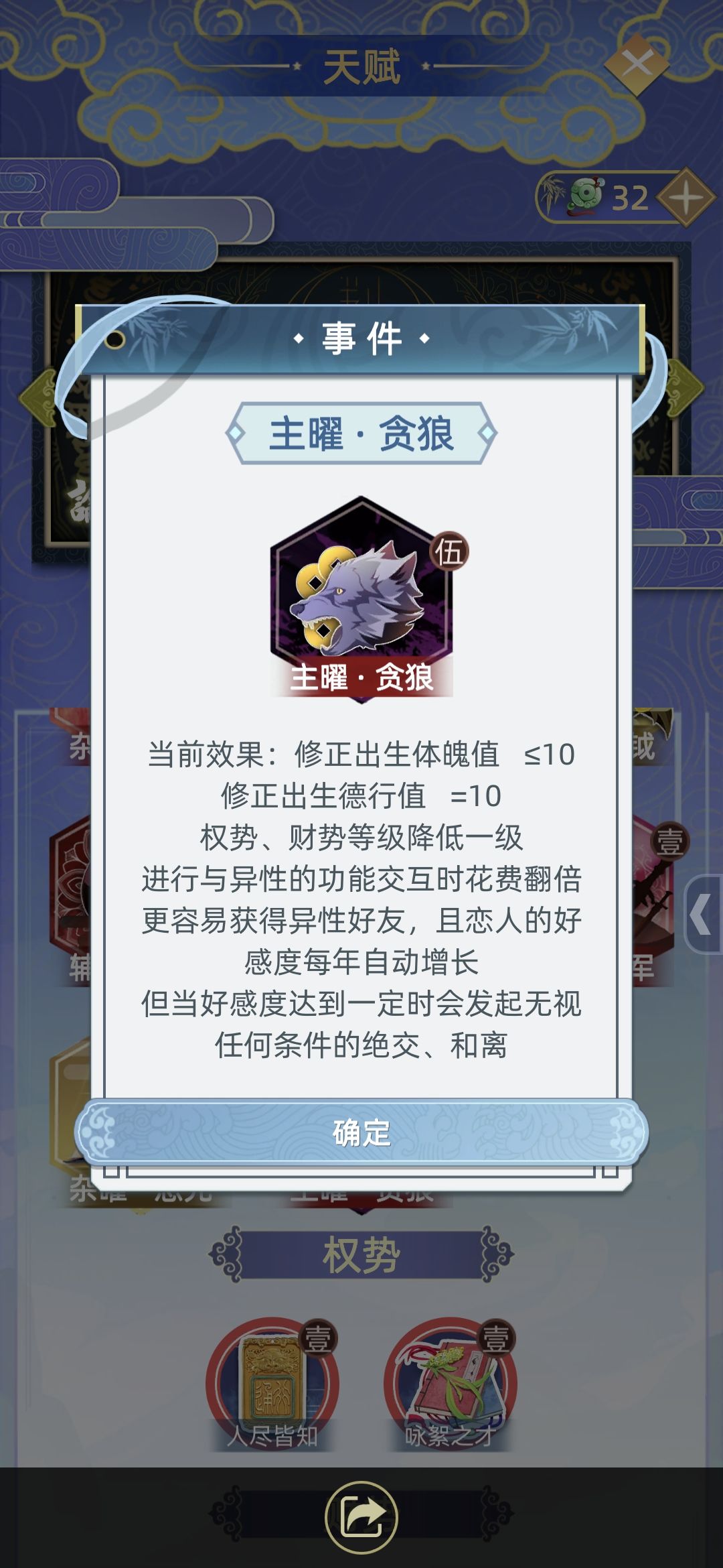 技巧一,不要升到满级!不要升到满级!不要升到满级![表情_豹哭] 我真的好后悔! 我下载的官方国际版,不知道为什么, 只有升到第二级,会触发体魄值和道德值的强行修正,后面的几级都不会。 只有第五级,也就是满级,才会开启贪狼的 满级好感自动合离分开 的效果。 所以升到4级就可以了,2.7倍,少拿一点,但最舒服了,啥限制都没有!就跟没用贪狼一样! 技巧二,男主控千万不要娶妻!只纳妾!女主控在好感接近满