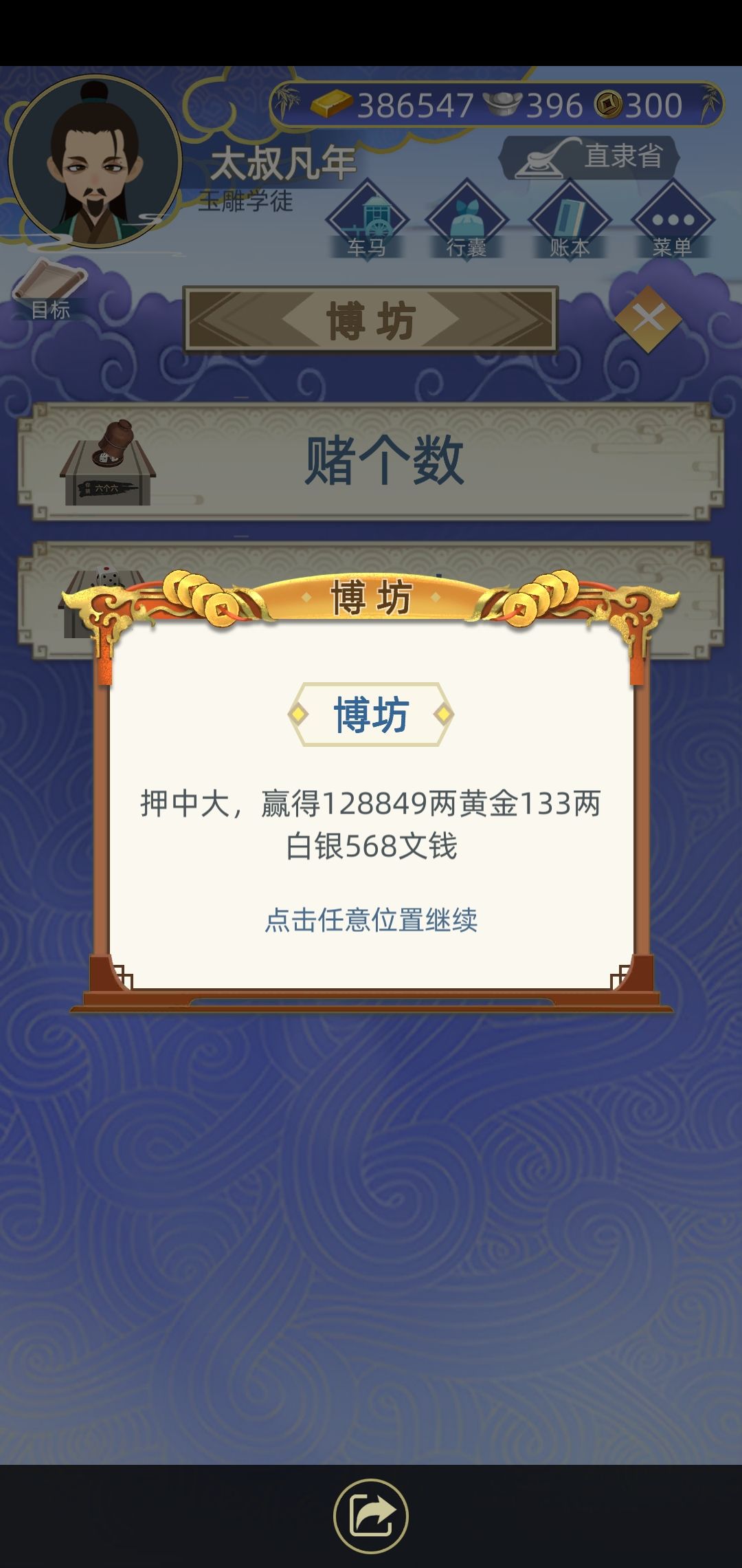 胜乘1.5,败乘0.5 豹子为特殊情况 知己一号100银=0.1金,之后不断翻倍,娶n个知己需要花费【(2的n次方-1)/10】金 无限sl胜利,则无限找知己。 另加18后每年瓦舍20个,清单个最高不超1w金,红不超1k金,办梳拢清变红。