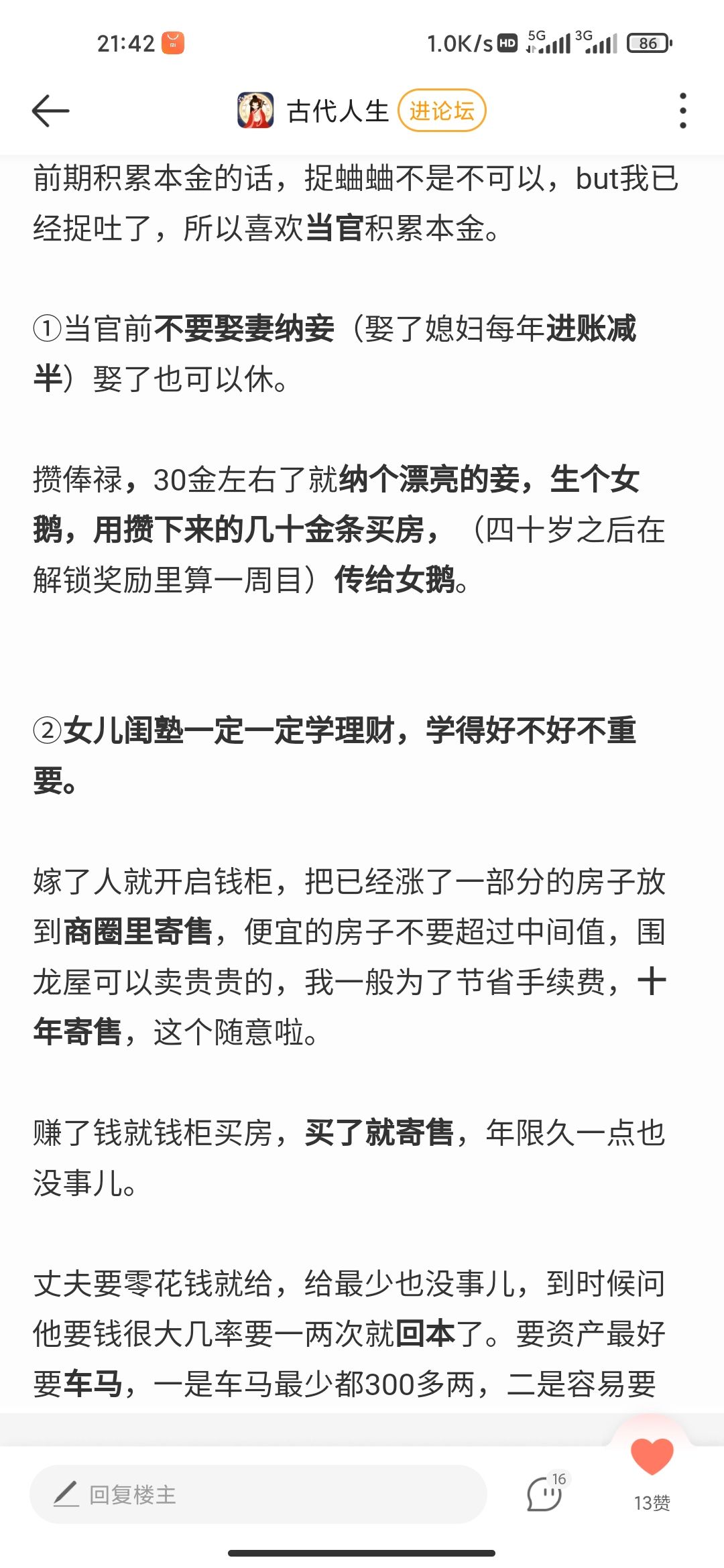 最近呢,我看古代人生都在出攻略,那我也出个攻略吧,这个攻略比较适合那些没有什么钱的小白,然后呢又适合种田忘记收获的小傻瓜,好啦,话不多说,攻略来了,这个建议呢,开局就玩男生,参加科举做官,然后呢做官,攒了个几十金之后呢,就买那个一金的房子,嗯,然后弄个几十年,然后你再到你的孩子身上,再然后呢,他就会翻个几倍,如果说不是你满意的价格你可以先不买,然后你再继承到你孩子身上,这样子一直下去估计就会翻个几十倍,到时候你就可以赚很多钱了,我就是这么做的,结果赚了个几万金,有一次我好像忘记结婚生子了,自然死亡,然后钱直接就全没了,重新开始🌝,幸亏只是个游戏,要是真的,我真的死不瞑目🌚