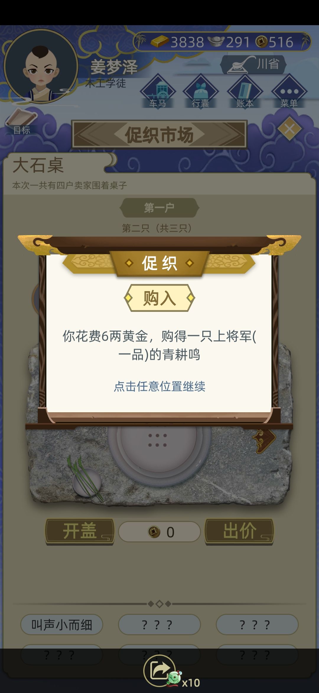 不进赌场怎么快速赚钱?(我自己的经验) 首先抓促织然后卖了到一两黄金左右 再去促织市场选择一百两白银的摊子(只要比小贩报价的一半多一点就可以拿下,然后去转卖) 这样积累到六七十两黄金后就开始种田 然后边种田边转卖促织积累资金😆 之后就是边种田边买房 这样之后就不用担心钱的问题了🙋