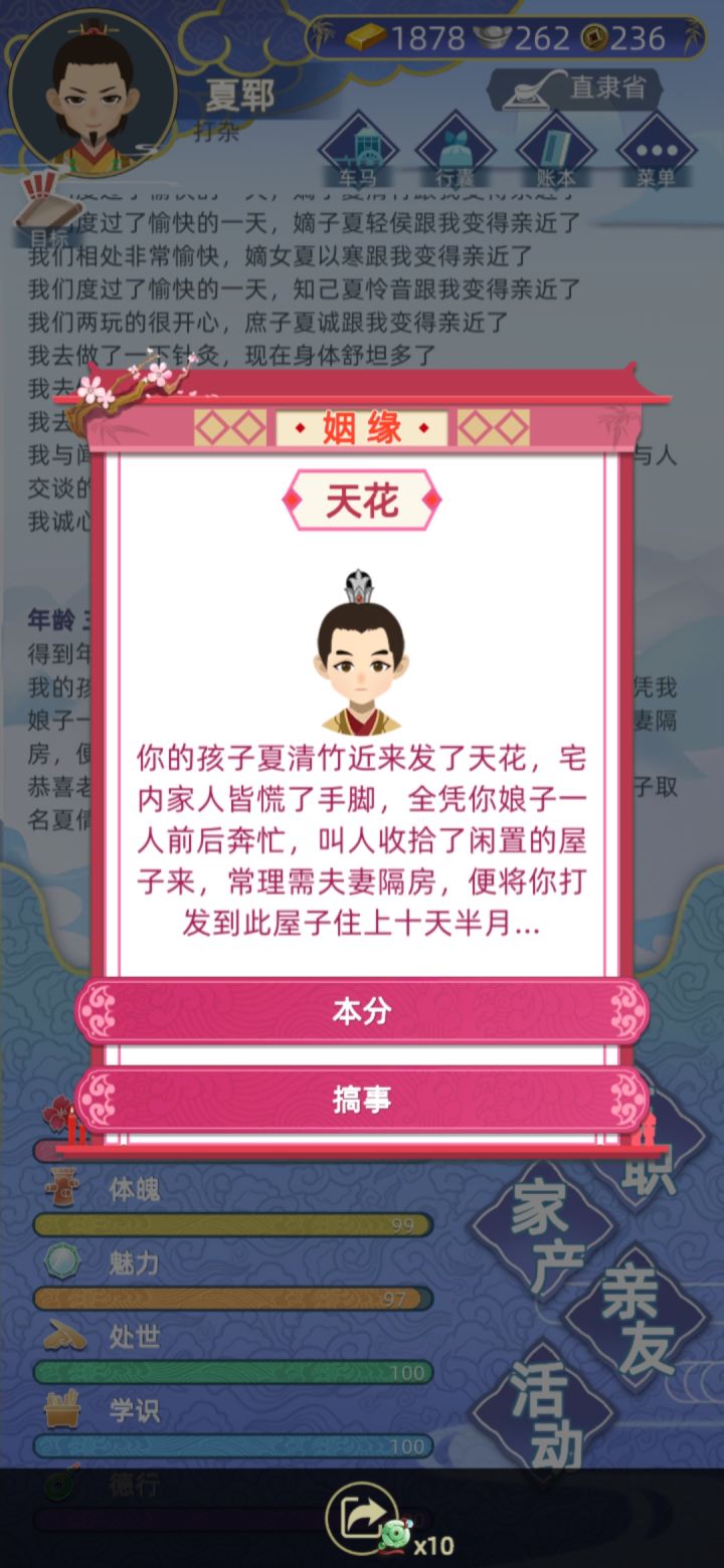 我爹去瓦舍瞎,我妈喊我去看看,我一看,有个美若天仙的金瞳清倌人,我就拐回来了,找个媒婆立誓做知己,大家都很和睦,知己和妻子感情甚好啊,可是,为什么我的好大儿的天花系统要引导我作妖家庭和睦,我也不是那搞事的人啊,所以如果我搞事我的漂亮好大儿会不会变麻子