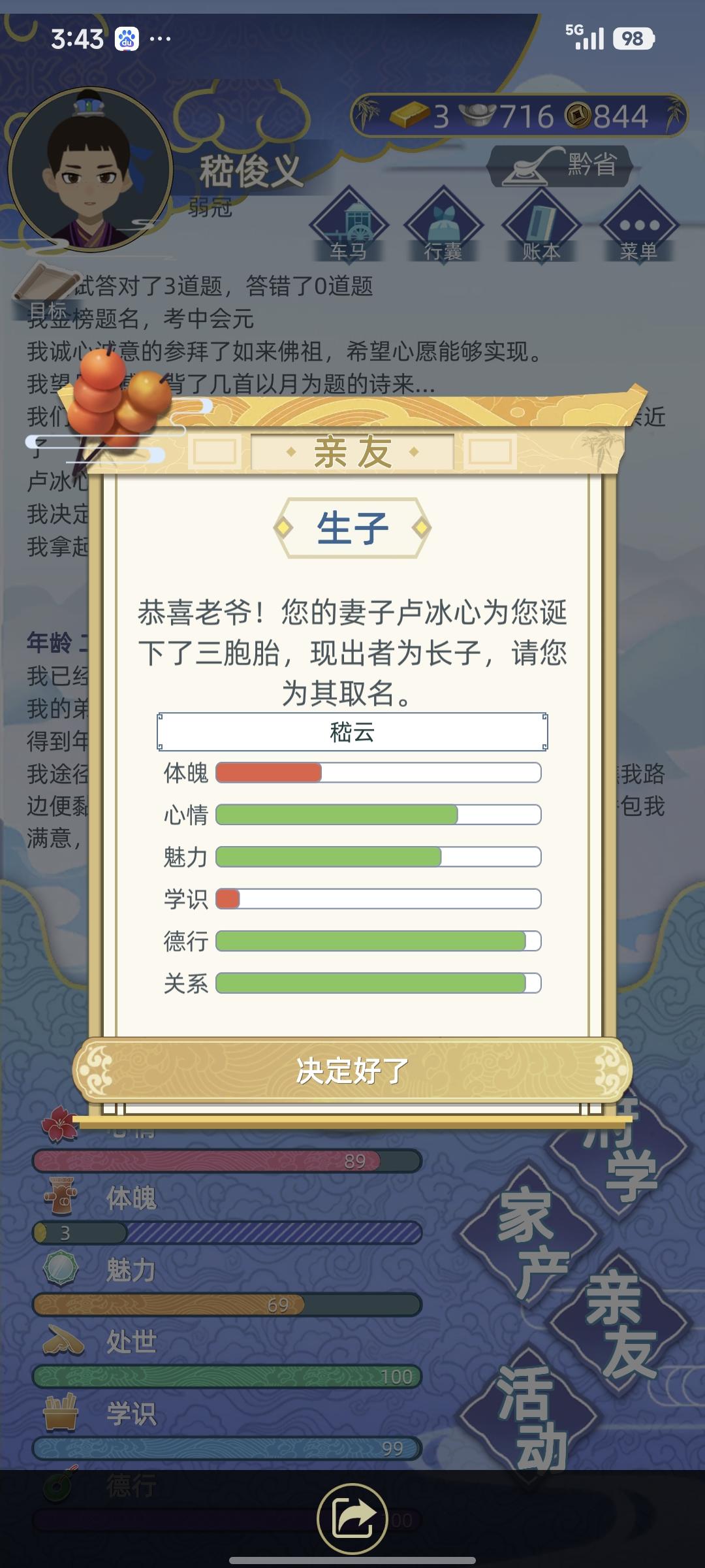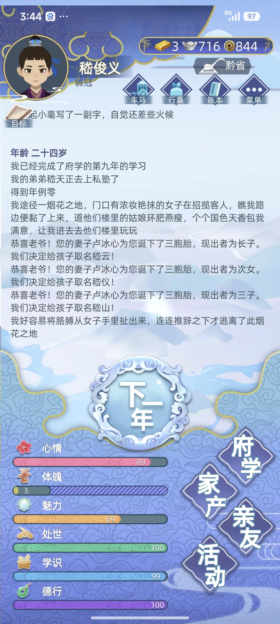 [楼主温馨前提:这一篇的攻略是完美主义者的福利哦,大家可以不用全部完美达成这些条件也可以拿到高山景行,如光风霁月的成就评价哦,尽力而为即可]这是完美达成成就的条件和攻略:二十岁之前完美六维满值(拜如来佛祖加六维,每年去客栈找秀才或捕头聊天加学识,去客栈天品客房独自一人睡觉加大把体魄,每年必点学习加学识)➕才华横溢连中三元从二品巡抚仕途起点➕正妻和知己都是大学士的嫡长女或者嫡女家世富甲一方且