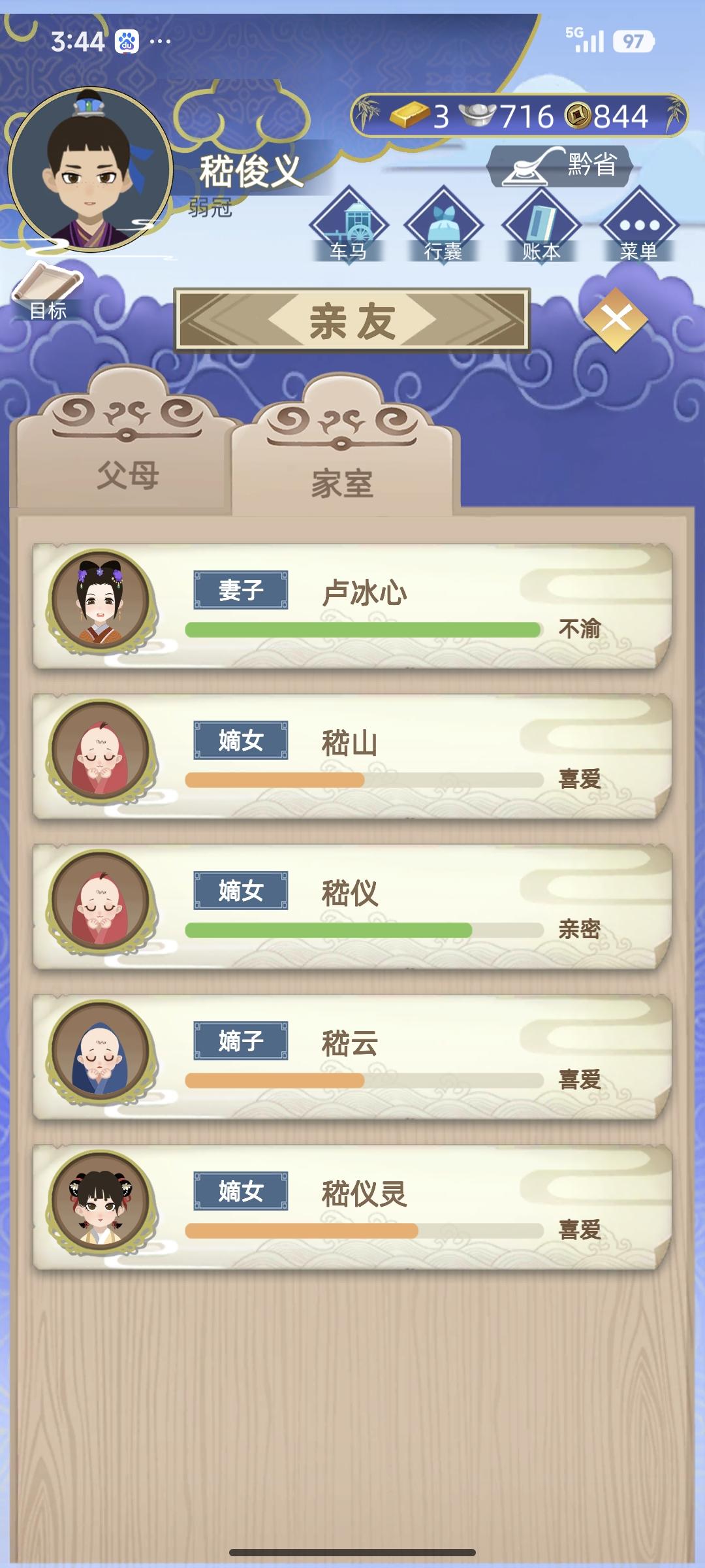 这个角色我就一直佛系玩,每年都以为要去世了,结果把丈夫熬没了,二儿子早逝,大儿子儿媳也早逝,孙女嫁了个超级丑的孙女婿还生了个女孩……终于在104岁寿终正寝了。那个骗人的道观骗了她三百两白银,结果丹药没有用。做闺塾教授能做到年例754两应该蛮罕见吧,也记录一下,全靠活得久。