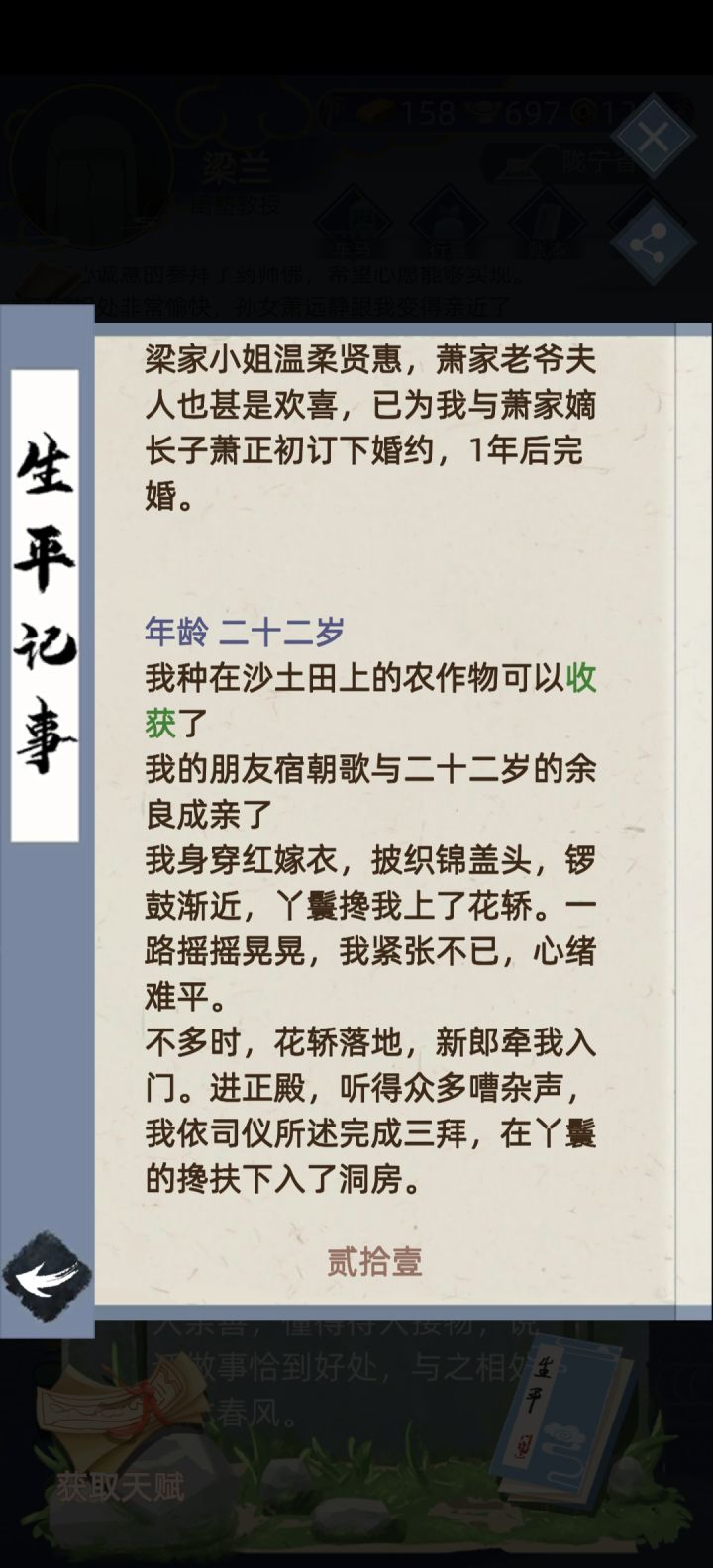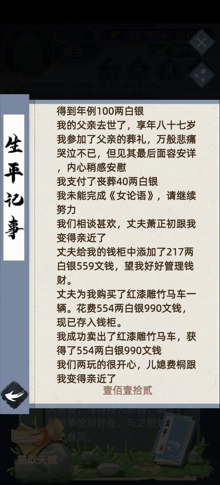 这个角色我就一直佛系玩,每年都以为要去世了,结果把丈夫熬没了,二儿子早逝,大儿子儿媳也早逝,孙女嫁了个超级丑的孙女婿还生了个女孩……终于在104岁寿终正寝了。那个骗人的道观骗了她三百两白银,结果丹药没有用。做闺塾教授能做到年例754两应该蛮罕见吧,也记录一下,全靠活得久。