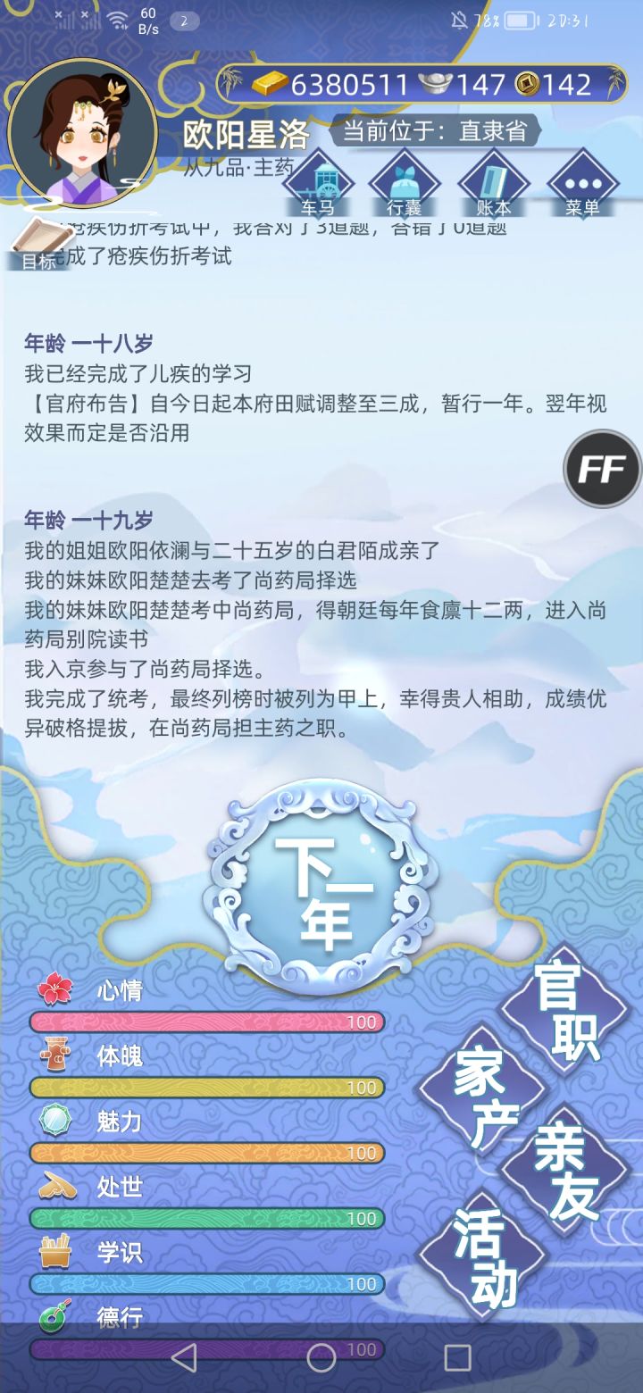 带上恩光天赋,19岁贵人相助,获得从九品主药的官职,之后每一年一步一个脚印都升了一级,最后24岁成为奉御总结一下,首先前面的答题网上都有,再是制药也有攻略(你配药考试时配的药方记录在医书上均可用)我那个药方专治P9那种病,一次感悟长很多,每年可以通过配药(重复配最高品阶的药长的最多)治病(越困难治好感悟长的越多,不过治不好可能掉感悟,甚至极少情况下降职,不过也有的版本困难级别治疗失败也会加一点感
