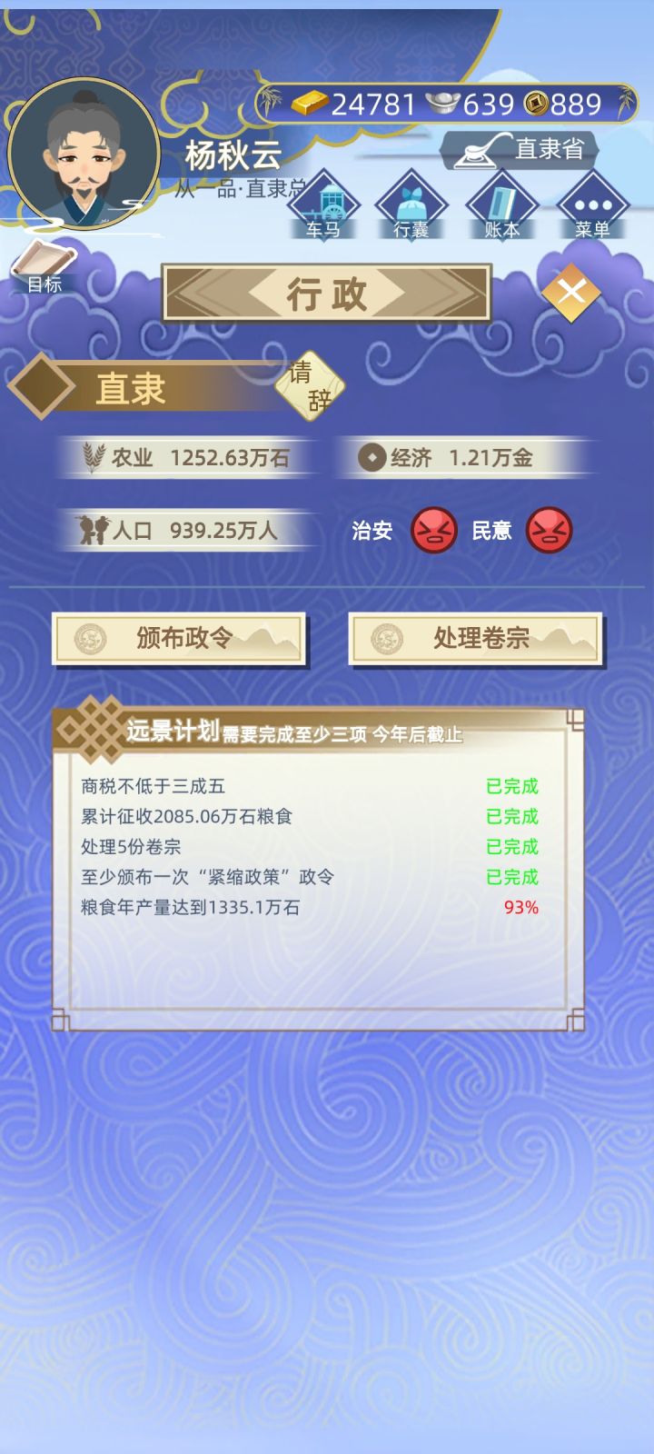只要开局把税收拉满,我们不用管安居乐业,保证能完成朝廷下发的其他任务(在百姓眼里估计是个昏官,不过咱不贪污),只要完成部分任务,朝廷不会降职甚至会升官(毕竟他们只看税收)——————————————————————————我真的忠君爱民,鞠躬尽瘁,不然怎么会升官呢?