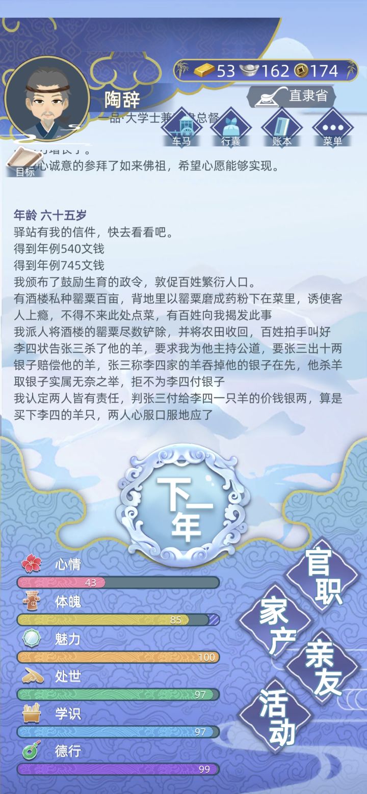 这个角色我就一直佛系玩,每年都以为要去世了,结果把丈夫熬没了,二儿子早逝,大儿子儿媳也早逝,孙女嫁了个超级丑的孙女婿还生了个女孩……终于在104岁寿终正寝了。那个骗人的道观骗了她三百两白银,结果丹药没有用。做闺塾教授能做到年例754两应该蛮罕见吧,也记录一下,全靠活得久。