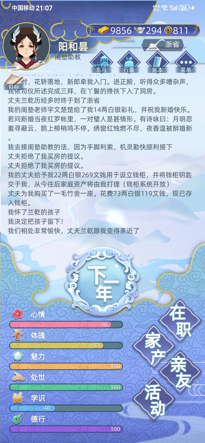 玩了一段时间了,走过不少弯路,一些避坑小心得给需要的朋友分享一下。①心情:没事多喝茶!!杂市攒《笑林广记》!!客栈刷旺财,猫咪!!②体魄:医馆三连刷(尽量刷到10)!武馆尽量射中心!拜药师佛,如来佛祖(全+) ,四大天王。(拜佛加成不多)。③魅力:杂市攒曲谱!客栈涂瑶加成最多!(请其他姑娘吃水果糕点,喂猫),寺庙拜普贤。④处世:跟客栈姑娘多交流!捕快 秀才以及不认识的特殊角色不要聊。拜观音