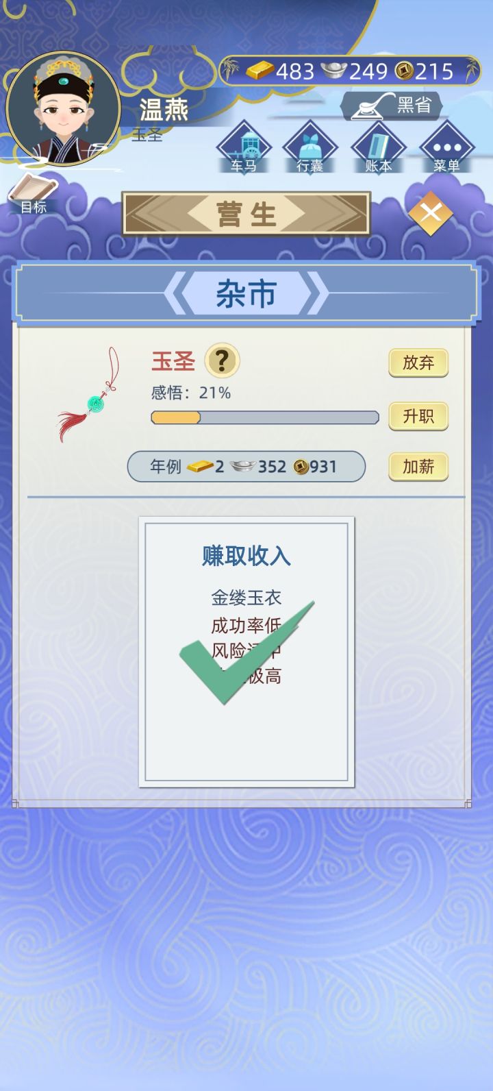 只要开局把税收拉满,我们不用管安居乐业,保证能完成朝廷下发的其他任务(在百姓眼里估计是个昏官,不过咱不贪污),只要完成部分任务,朝廷不会降职甚至会升官(毕竟他们只看税收)——————————————————————————我真的忠君爱民,鞠躬尽瘁,不然怎么会升官呢?
