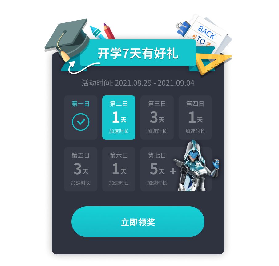 哈喽,各位旅行者/探索者: “未觉池塘春草梦,阶前梧叶已秋声”,开学的日子来临,小伙伴们也从快乐无边的暑假生活逐渐开始忙碌。 狗子希望大家在学习之余,能够找到一些游戏可以陪伴青春年少的时光; 也希望Tap加速器能够出现在大家的游戏时光里~ ◆ 2021.8.29 - 2021.9.4,Tap加速器内会开展「开学7天有好礼」连登送好礼活动! 每日登录 都可以获得 全球加速时长, 连续登录7日 可