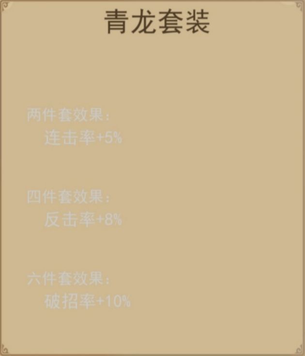 青龙套装两件套效果:连击率+5%四件套效果:反击率+8%六件套效果:破招率+10%白虎套装两件套效果:暴击率+8%四件套效果:暴击效果+50%六件套效果:每次暴击获得“暴击率+2%”的增益朱雀套装两件套效果:着火率+10%四件套效果:着火伤害+50%六件套效果:装备的所有召回率在每次攻击时都有50%的几率变为双层着火率玄武套装:两件套效果:真气回复速度+20%四件套效果