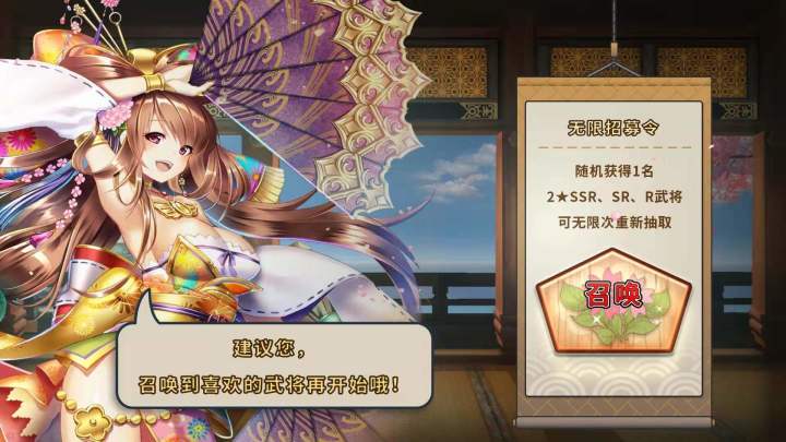 《战国明日香》非常良心的加入了一个初始SSR无限召唤功能,这样大家就可以100%获得SSR级别的初始角色,而且可以不断重置到自己喜欢和满意的角色为止!首抽SSR怎么选?看这篇就够了以下内容为个人拙见,仅供参考。论万能:斩系武将,挂机必备特点:攻击范围大,自动战斗效率高武田信玄,甲斐之虎,有着游戏中最大的XX。技能1:破空裁决,后跳斩可以躲避技能。技能2:旋风乱舞,按住不放可以一直转转