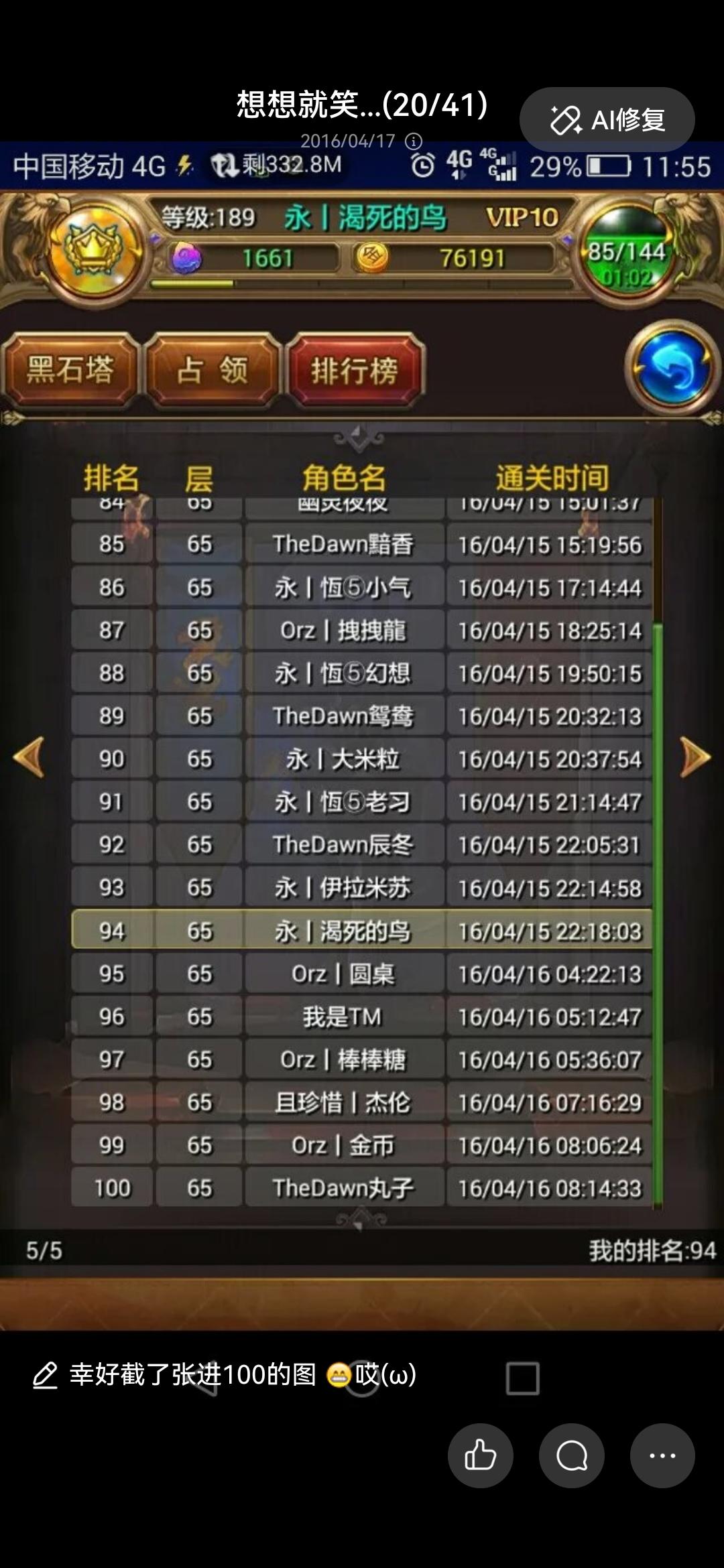 : 赞。同为mter三年时光见证了这个游戏的发现兴衰,同时也认识了好多朋友及真正的土豪。感觉是个最良心的游戏。良心的卓越!虽然已经脱了一年,不过还是怀念一起打本的感觉。想起来我做出来五小强在公会本终于不被秒的时候那种内心的兴奋感!大爱