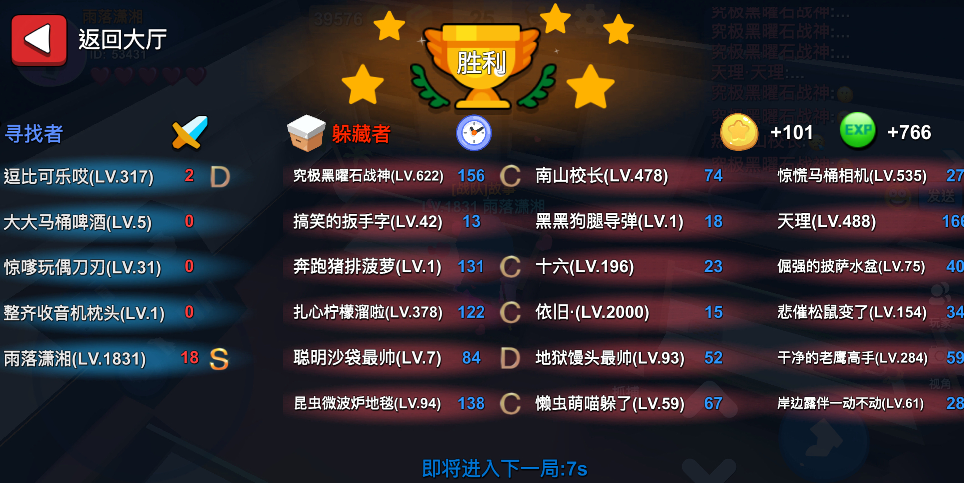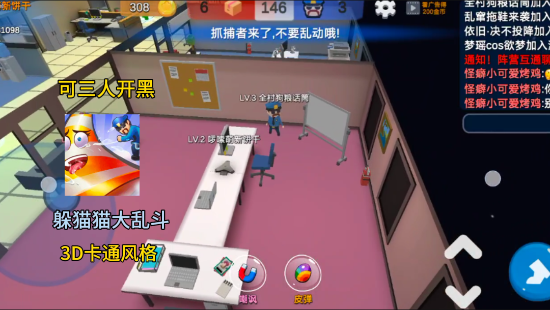 游戏介绍:游戏分为抓捕者和躲藏者两个阵营,每一局都有平均40秒的准备时间,抓捕者需要在准备阶段内记住地图中大部分物品的数量和位置(同时躲藏者要在准备阶段内寻找合适的地点进行躲藏) 技巧: 抓捕者:(1)注意事项:没有十足的把握不轻易 抓捕,抓捕的五滴血容错很低,多利用场上道具给的提示来寻找(新手可花15金币来购买提示) (2)简单判断躲藏者:①离墙体十分近的或者与墙相贴甚至穿模的大概率是躲藏者 ②